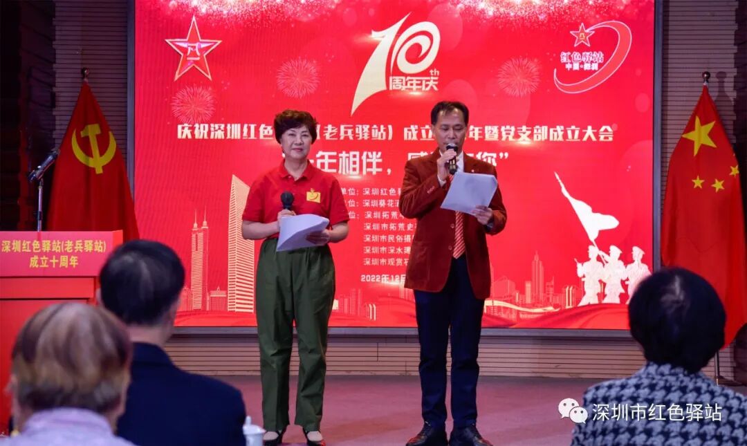 中共深圳市文创体育类社会组织联合委员会第一书记杨素贤女士代表深圳社会组织致辞,热烈祝贺深圳红色驿站(老兵)驿站成立十周年暨党支部成立大会圆满成功!并对驿站平台建设和未来发展提出了希望。杨书记指出:深圳红色驿站是一个非常好的战友交流平台,过去十年来,在服务老兵、公益活动和帮扶解困方面做出了很大成绩。支部成立后要在方方面面尽心竭力更上一层楼,为老兵群体多做一些力所能及的好事,把红色驿站真正办成老兵之家。