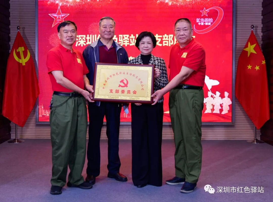 会上,深圳市文创体育类社会组织联合委员会第一书记杨素贤代表上级党委为红色驿站党支部授牌,同时举行了深圳市大通高新科技发展有限公司为红色驿站的捐款仪式。
