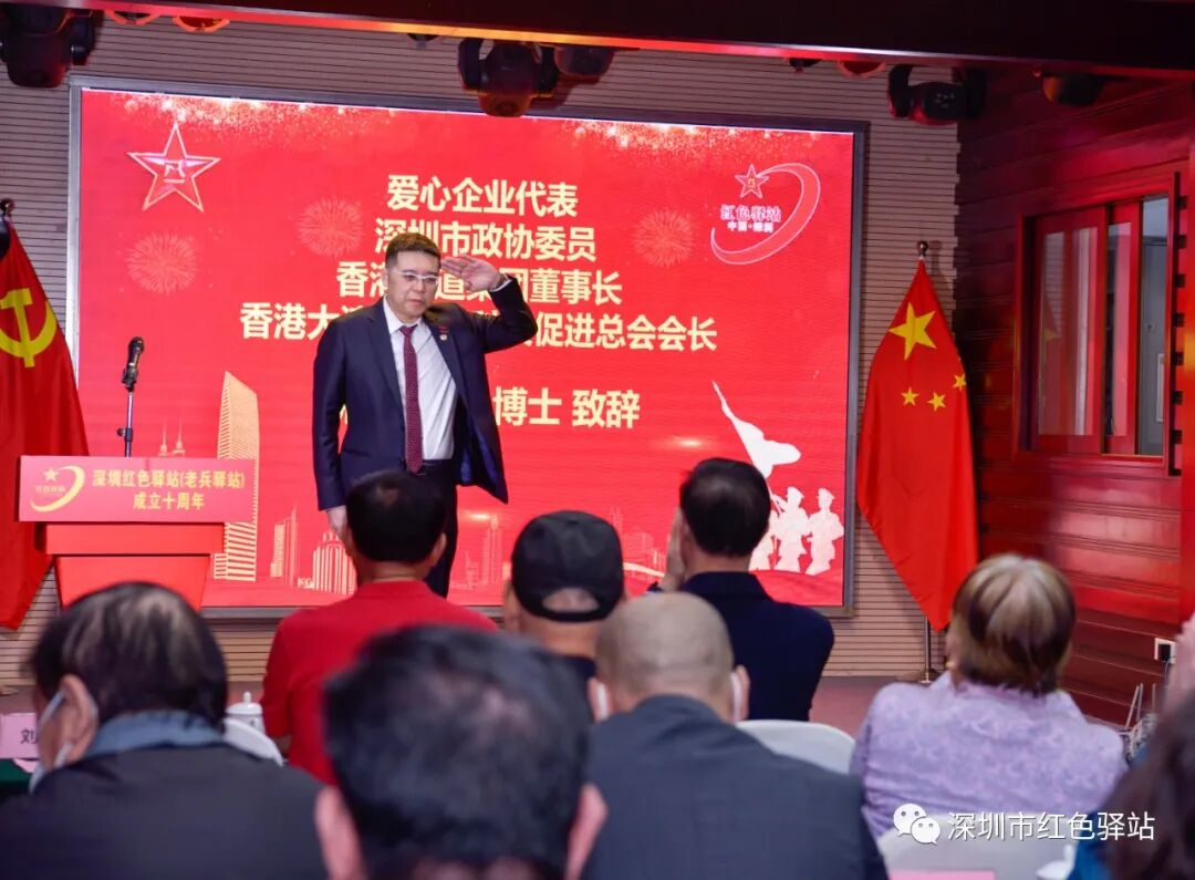 香港中道集团董事长、香港大湾区军人科技促进总会会长、深圳市政协委员、深圳红色驿站荣誉站长荘紫祥博士代表爱心企业发表了热情洋溢的致辞,荘紫祥博士在致辞中对深圳两万基建工程兵战友在特区建设中打造的三天一层楼的深圳速度和拓荒牛精神给予了高度评价,他表示,作为在深港资企业是改革开放、特别是香港回归祖国后红利的最大受益者,一定要最大限度的履行企业的社会责任,回馈祖国、回馈社会、回馈老兵。他说,深圳四十年来由一个边陲小渔村逐步变成如今的国际大都市,最应该感谢的就是基建工程兵,中道集团将不遗余力在平台建设、市场开发、资金扶持和关爱老兵等方面给予红色驿站大力支持。