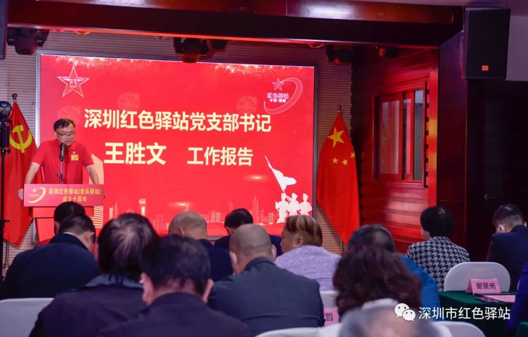 ”深圳红色驿站党支部书记王胜文代表红色驿站(老兵驿站)作工作报告,王书记在报告中全面总结了深圳红色驿站(老兵驿站)成立十年来在平台建设、老兵服务、帮扶解困和社会公益等方面做出的成绩。王书记指出:深圳红色驿站的办站宗旨就是搭建战友交流与服务平台,十年来的实践证明,红色驿站(老兵驿站)的工作是光荣的有益的,能够持之以恒坚持十年为老兵服务不走样、不变味是难能可贵的。王书记强调:红色驿站将传承好老兵驿站的接力棒,秉承老站长的办站宗旨,不忘初心,牢记使命。站在更高的起点,通过平台升级,品牌再造,系统地开发和完善平台功能,打造红色文化,为战友们创造更加温馨和谐的精神家园。