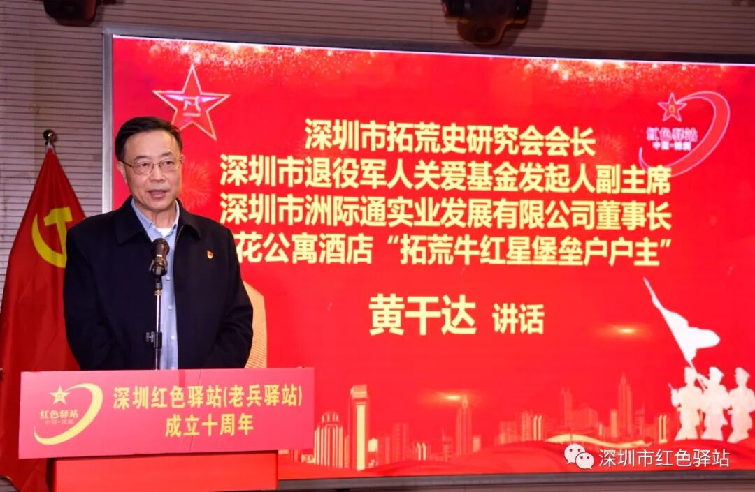 原基建工程兵老战友、深圳市拓荒史研究会会长、深圳市洲际通实业发展有限公司董事长、葵花公寓酒店“拓荒牛红星堡垒户”户主黄干达在讲话中高度评价了深圳红色驿站(老兵驿站)十年来在宣传、展示基建工程兵四十年来在深圳特区建设中的拓荒牛精神方面带了个好头。他说,继深圳红色驿站(老兵驿站)成立之后,深圳先后又成立了拓荒史研究会、00019部队战友联谊会和深圳市文华音乐中心等社团组织,目的就是要传承基建工程兵深圳拓荒的历史,不忘初心,牢记使命。为曾经的建设者呐喊。红色驿站正是这支社团组织的领头羊,第一个开启了基建工程兵战友交流服务平台,通过驿站的努力,使我们基建工程兵在深圳乃至全国有了很高的知名度。今天红色驿站举行十周年庆典活动,就是要弘扬和传承这种精神。我们拓荒史研究会愿与其他兄弟组织一道,团结带领深圳基建工程兵战友在社会各界的关怀和支持下,一如既往地做好基建工程兵精神的传承和爱国主义教育,为老兵群体和社会服务做出新贡献。