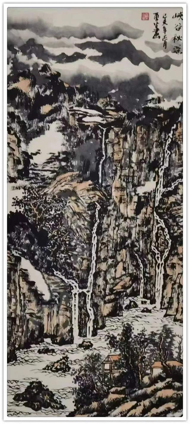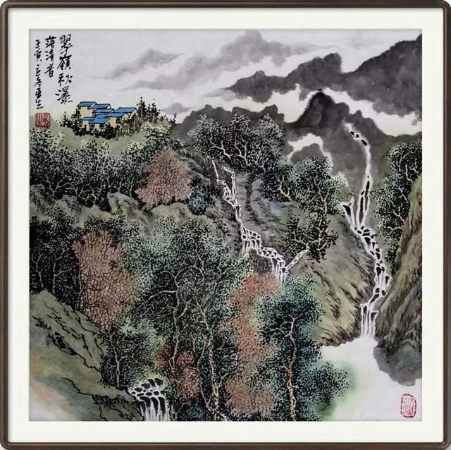 翠岭秋瀑落清音,隐约山阶有人影。
