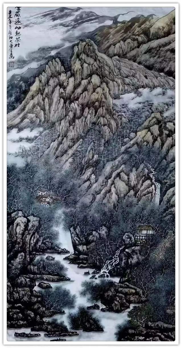与此同时,笔墨的创作表现也是有在其不同的画面尺寸中得到了各自相宜的味象对照!臂如在宏幅大作中的山水笔墨,就是可见于一种返璞归真的形意变化,而在小品画面中的山水笔墨,则又是可见于一种精悍隽永的线面交错!大幅山水,是有抒逸气之豪迈,小品山水,是有见空灵之秀润,但无论作品画面最终是以前者格局来表现,还是以后者格局来表现,其笔墨的味象皴法和氤氲之气都永远是离不开心迹的意识交融!此真是外师造化,中得心源,画意淋漓,可蕴其真!