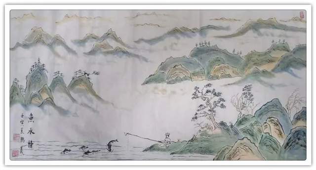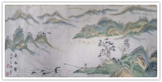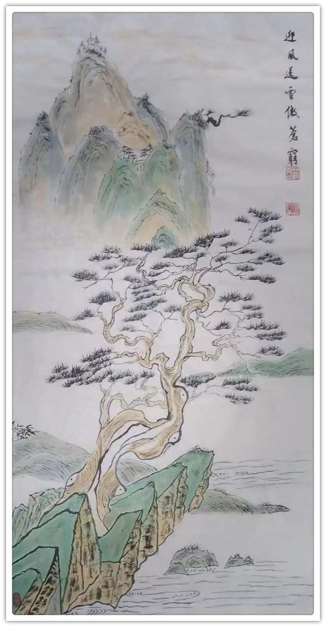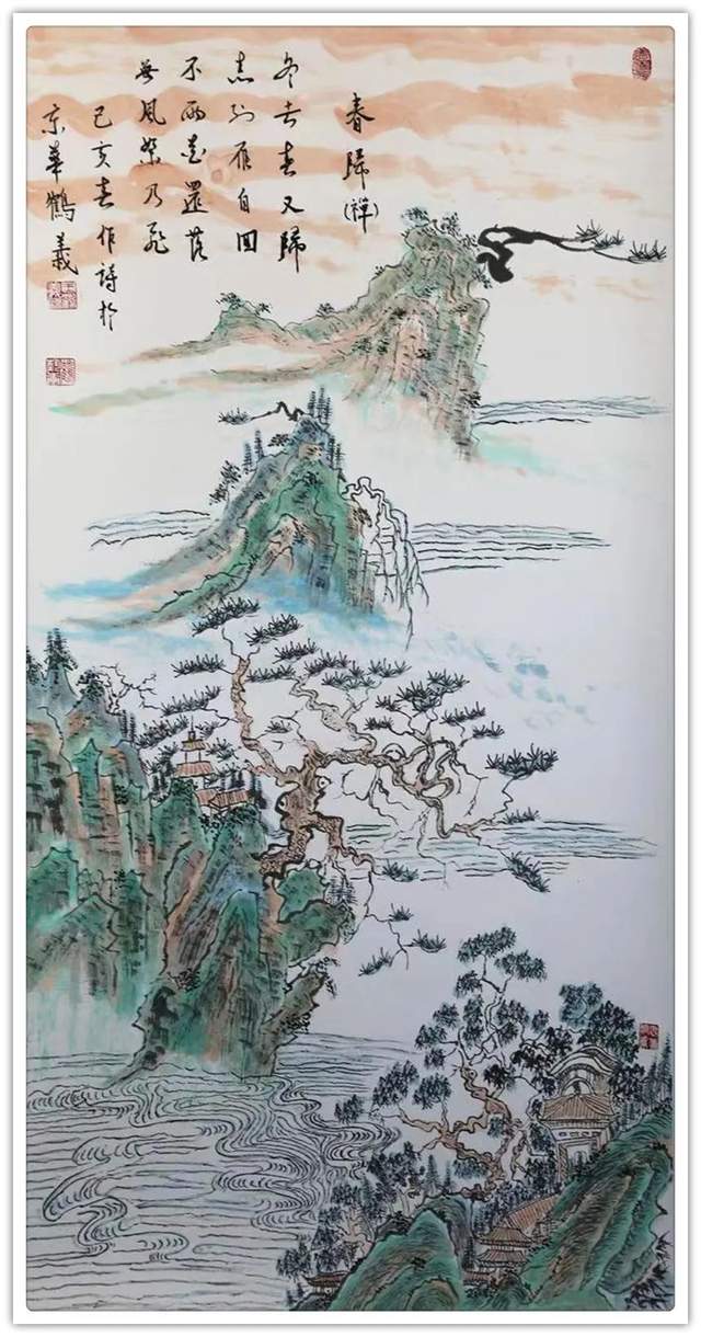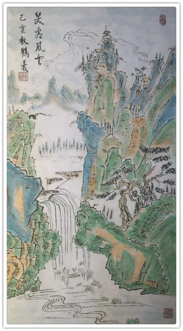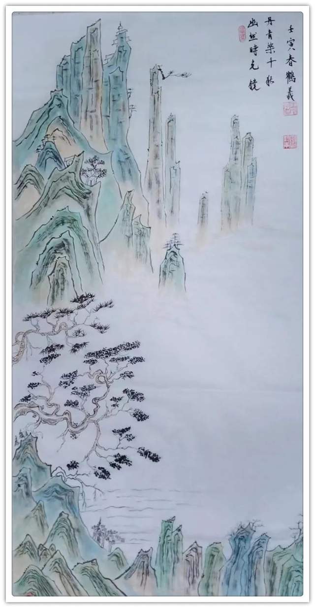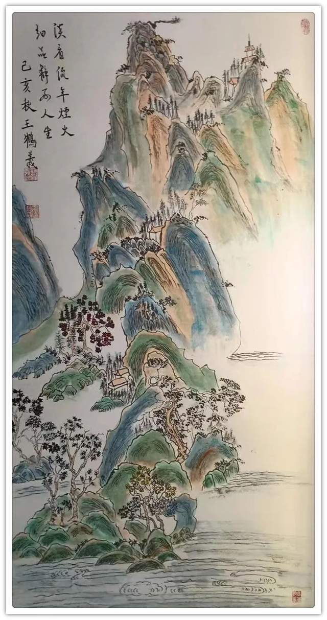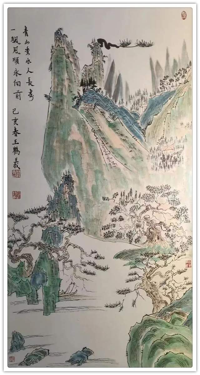 在山水丹青的创作上,王鹤义先生是有极其深谙于对青绿山水的表现法门,但画中的自然美感,却并非是来自于取法的法门,而是源自于王鹤义先生对画面各项细节的把控布局,即是味象其形和随类赋彩,而经由此所描绘出的山川溪流和云烟屋舍等画面表现,也都是尽可以达到一种可游可居的畅神境界,赏心悦目,大美和谐!当然,这一切的创作基础也都是离不开王鹤义先生那深厚的笔墨功底,用笔之道骨力洞达,赋色之韵清秀致雅,并且无论是点线面之间的形态构造,还是虚实浓淡之间的浑然蕴藉,其在王鹤义先生的笔下可谓都是有得到了全面的造意融合!以技入道,匠心独运!