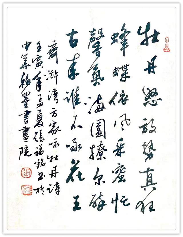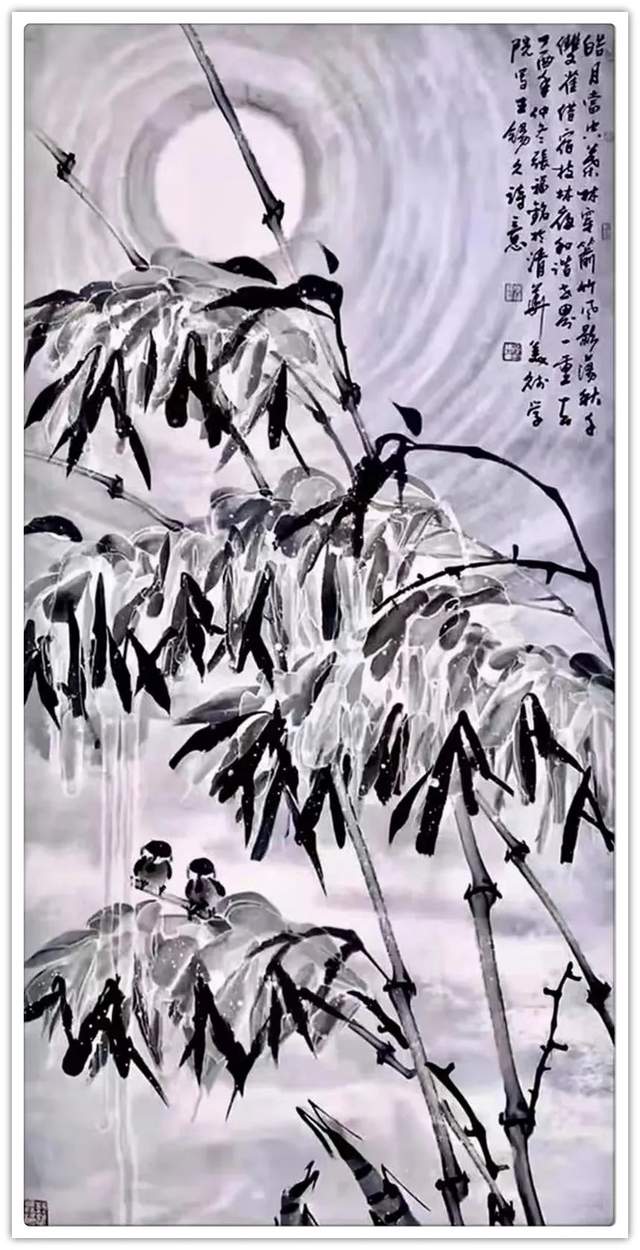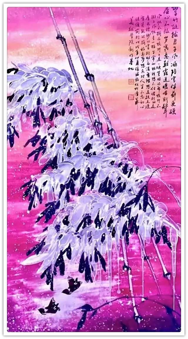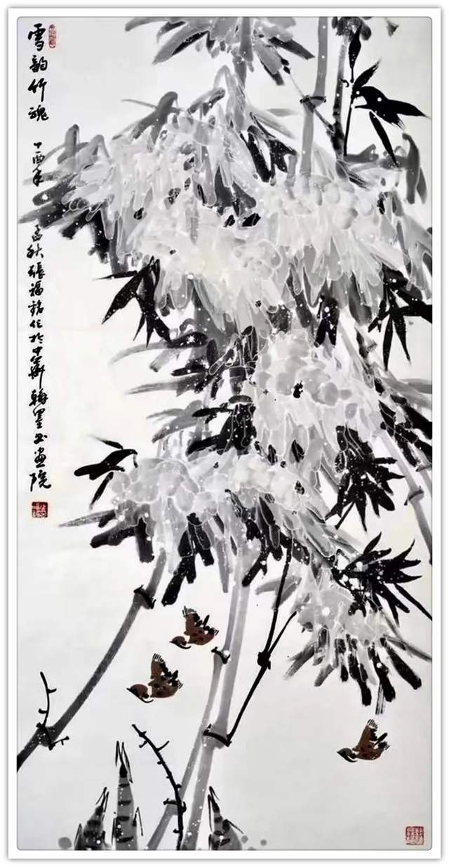 内容决定形式,构图服从立意,此是丹青要诀,张老作画不仅深遵此道,还以离形之神为空,以有形之神为生,作品构图主宾自然,虚实有度,画中之花有密有疏,若风中舞,若迎朝阳,画中之鸟有飞有鸣,相依竞生,若觅若嬉。宏观看来,整幅作品,生机盎然,朱浓紫丽,作品花草片枝,禽鸟飞流,观之既有隐士野逸之情,更有宽舒静德之美,俯仰婉约,芳溢九畹,蔚为当今画苑精作也!