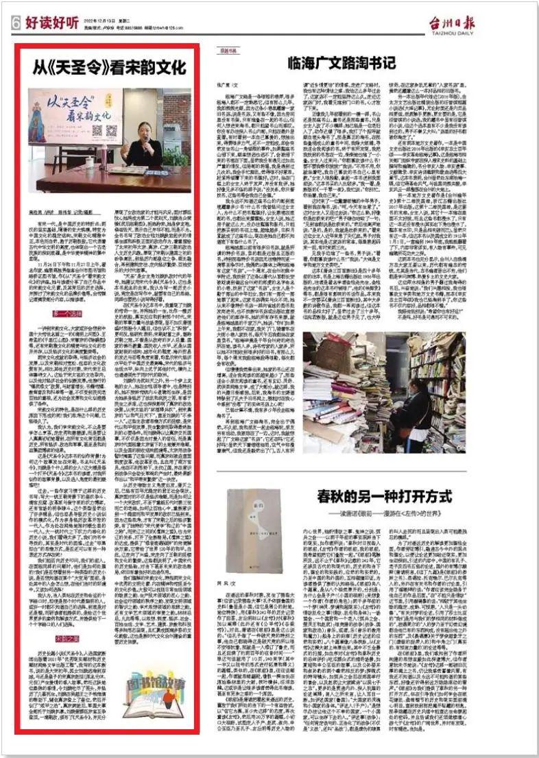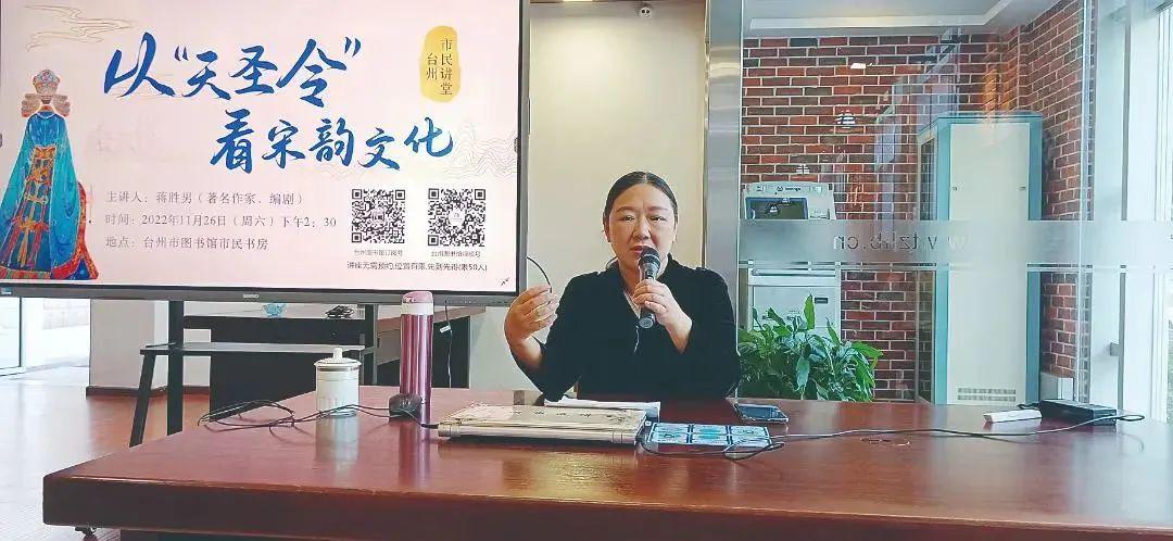 11月26日下午和11月27日上午,著名作家、编剧蒋胜男做客台州市图书馆和路桥区图书馆,作《从“天圣令”看宋韵文化》的讲座。她与读者分享了自己作品中的宋韵文化元素,及其背后的历史选择,并探讨了宋韵文化的品牌价值等。台传媒记者摘录部分内容,以飨读者。