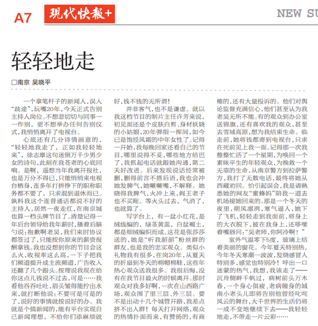 是啊,遥想当年我离开报社,也是万分不得已,只能悄悄来电视台栖身,连多年打拼挣下的职称职务都不要了,只求混到退休而已。孰料我这个连普通话都说不好的主持人,居然一夜走红,在南京城也算一档头牌节目了。清楚记得一年后台领导给我年薪时,搔着后脑勺说:抱歉啊老吴,我们来时协议都签过了,只能按你原来的薪资报酬拿钱。我也没想到你的节目会这么火,收视率这么高,一下子把我们频道提升成主流频道,广告收入还翻了几个跟头。按理说我现在给你这点儿钱说不过去,可是……我看他吞吞吐吐,眉头皱得能拧出水来,就打断他说:不要可是可是的了,说好的事情就按说好的办。我就是个搞新闻的,能有平台实现自己新闻理想,不给你们添麻烦就好,钱不钱的无所谓!