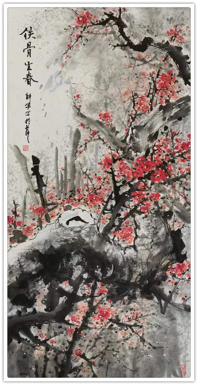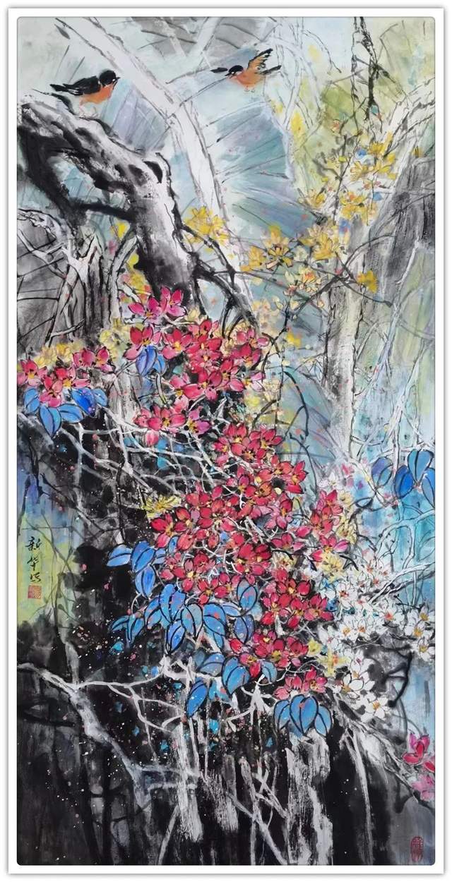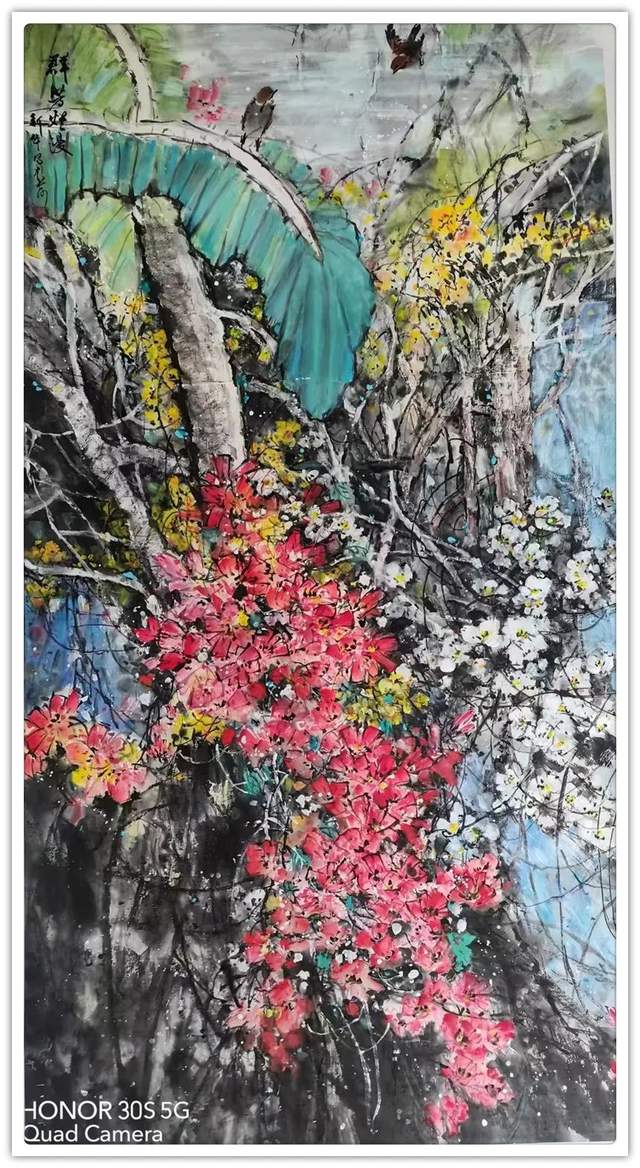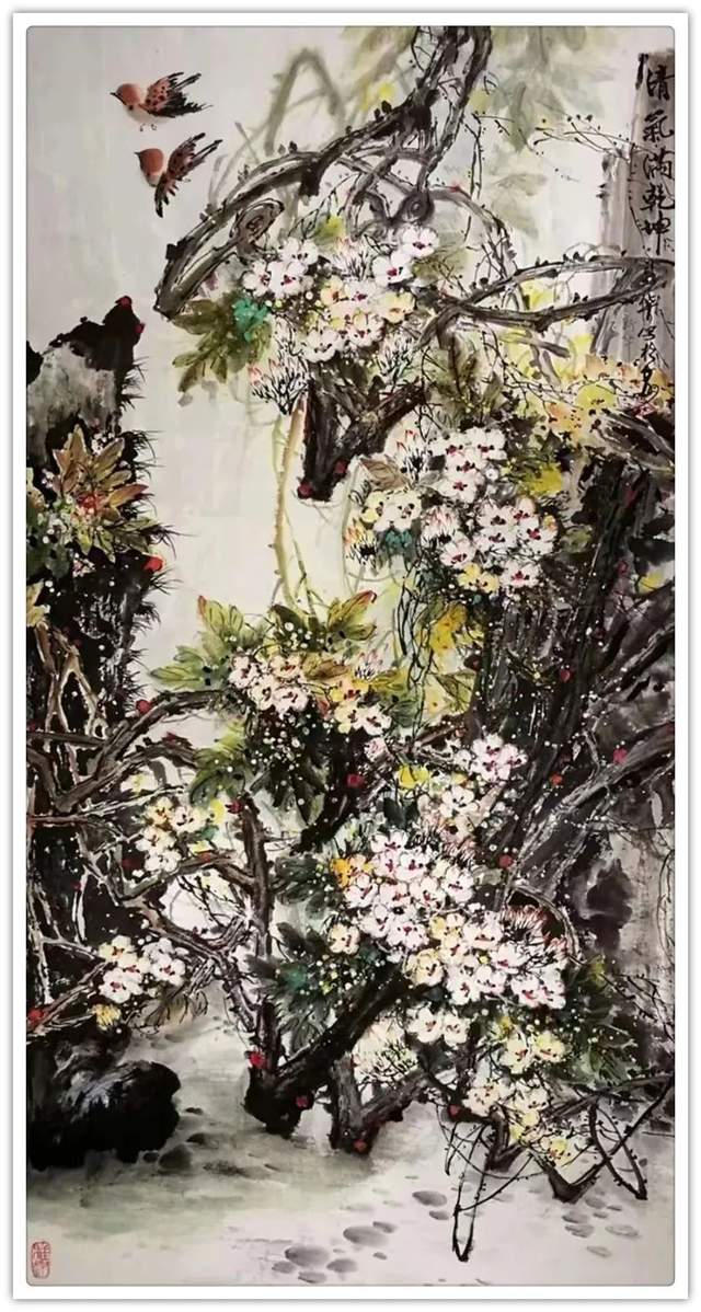 博涉诸多的传统画面题材,也可以说是易新华女士今日树立丹青高造诣的一个重要基础所在。像梅花、牡丹、紫藤等传统花鸟题材表现,可谓均是有在易新华女士的笔下得到了全面的个性舒张!首观其梅花众作,画中梅花是以写意格调为根基,又以文人风骨为立意,腊梅披雪,寒意正浓,但整体梅花却全然不失于老辣纵横之气概,枝叶虬枝屈铁,花卉浓艳盛放,如此画面布局,疏处即可见于空灵,而密处亦可见于丛深,其韵其神,可见卓然!再观其牡丹众作,画中牡丹是为雅俗共赏之佳品,牡丹气象以笔绘形,又以色感赋韵,并且整体赋色也都是十分贴合于自然,艳而不俗,丽而不媚,再配以绿叶丛生的画面氛围,便就更是有彰显于一股妙趣横生的审美格调!抒情达意,由此可畅!
