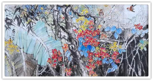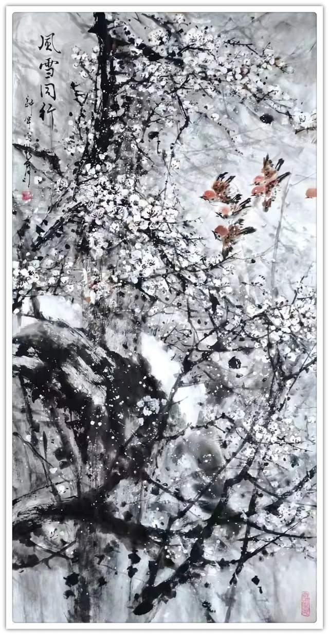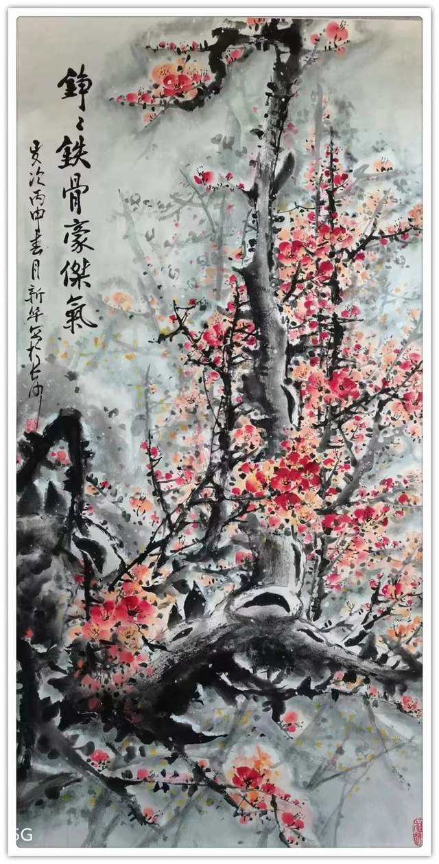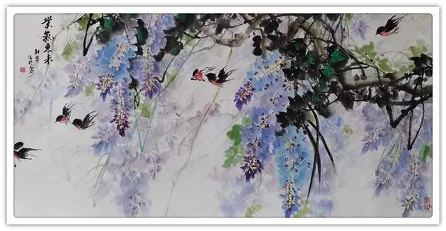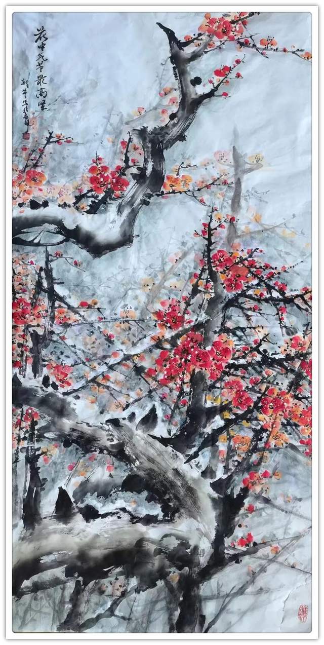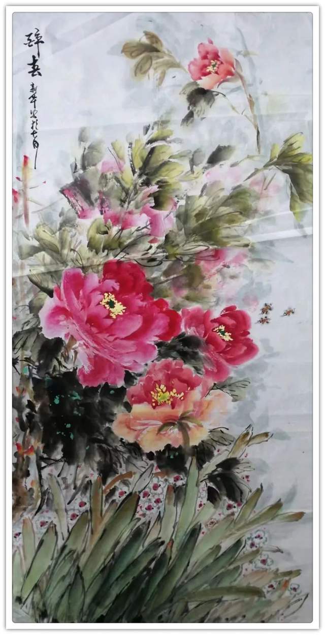 博涉诸多的传统画面题材,也可以说是易新华女士今日树立丹青高造诣的一个重要基础所在。像梅花、牡丹、紫藤等传统花鸟题材表现,可谓均是有在易新华女士的笔下得到了全面的个性舒张!首观其梅花众作,画中梅花是以写意格调为根基,又以文人风骨为立意,腊梅披雪,寒意正浓,但整体梅花却全然不失于老辣纵横之气概,枝叶虬枝屈铁,花卉浓艳盛放,如此画面布局,疏处即可见于空灵,而密处亦可见于丛深,其韵其神,可见卓然!再观其牡丹众作,画中牡丹是为雅俗共赏之佳品,牡丹气象以笔绘形,又以色感赋韵,并且整体赋色也都是十分贴合于自然,艳而不俗,丽而不媚,再配以绿叶丛生的画面氛围,便就更是有彰显于一股妙趣横生的审美格调!抒情达意,由此可畅!