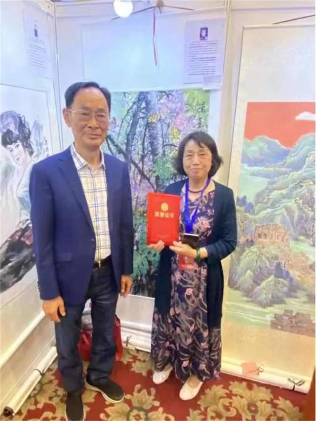 中央宣传部原副部长、中国文联原党组书记副主席胡振民2019年“翰墨风华”颁奖大会上给画家易新华颁奖并合影