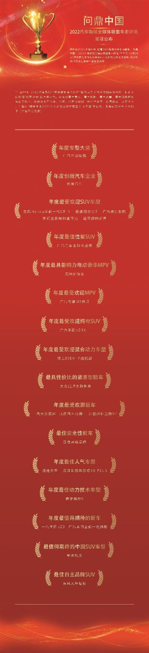 “问鼎中国-2022汽车新锐全媒体联盟车市评选”致力成为了当今中国车市独树一帜的风向标和“群英聚会”的重要平台。在充分尊重事实、尊重数据、尊重质量、尊重消费者反映的基础上,组委会本着公平、公正、公开的原则,经严格评审,认真评议,以下企业、车型在“问鼎中国2022汽车新锐全媒体联盟车市评选”中获奖。现将获奖名单公布如下(排名不分先后):