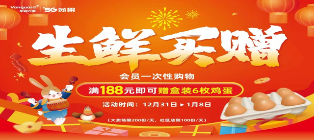 大促期间,华润苏果还将推出“跨年抽锦鲤,福兔迎年运”抽奖活动,会员购物满188元即可参与抽奖,大奖:1000元无门槛消费金,二等奖:100元苏果卡,幸运奖:手帕纸一小包。此外,还有乳品节-品牌120返50、生鲜买188元赠6枚盒装鸡蛋,并针对医护、街道、社区、环卫工作者开展新年感恩公益大派券等活动,打造惊喜购物体验。