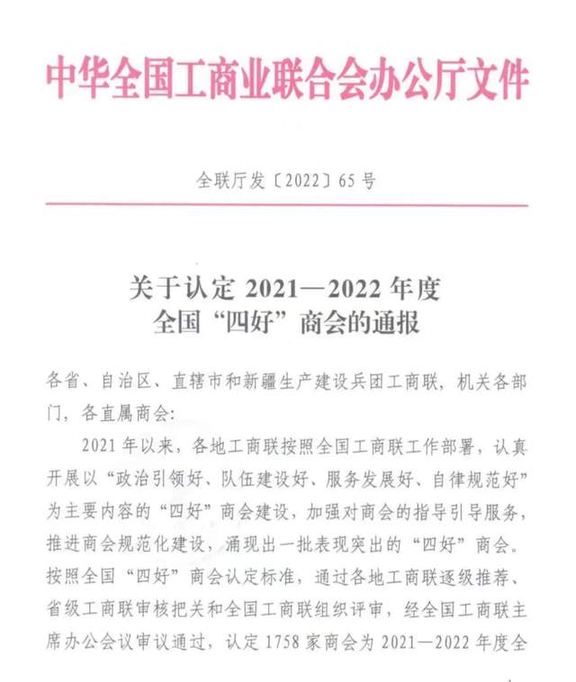 山西省厦门商会被全国工商联评为2021-2022年度全国“四好”商会