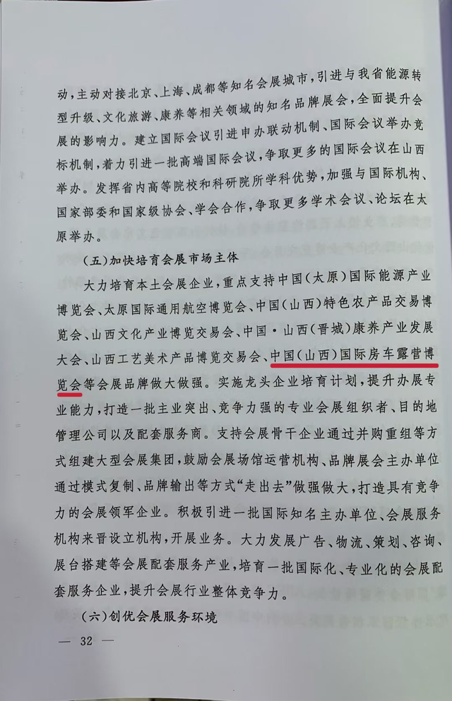 1月1日,已成功举办五届的“中国(山西)国际房车露营博览会”首次列入山西省“十四五”文化旅游会展康养产业发展规划。在“十四五”期间,山西省人民政府将重点支持中国(山西)国际房车露营博览会等会展品牌做大做强。本博览会是搭建山西省文旅的行业的重要平台、构建新发展格局的新载体、也是高水平对外开放的新窗口。也是我省主动与全国分享山西文旅发展消费展示的重要会展。