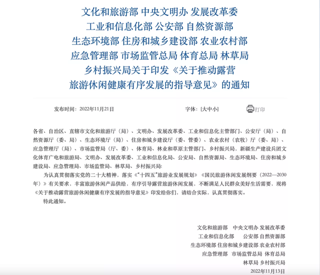 11月21日,国家十四部门印发《关于推动露营旅游休闲健康有序发展的指导意见》,为露营旅游行业发展指明了方向。