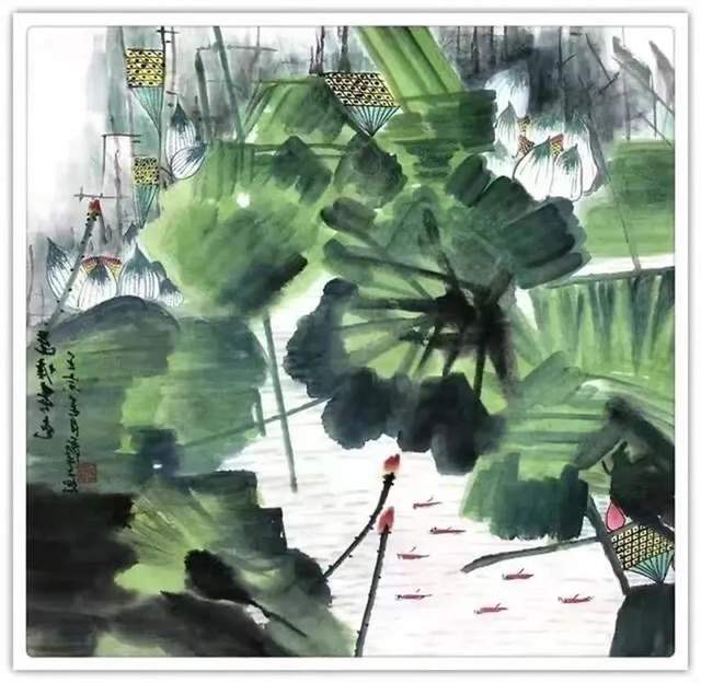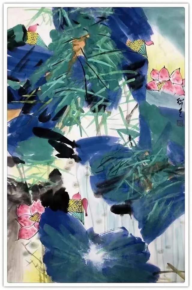 如果一个人心有疲惫心态,他的泼墨荷花就是一味壮志的良药,入目起效,神清气爽!每一片荷叶都写意成气度,每一枝立茎都焕画成筋骨,再赋胭脂艳红,纵然,点娇羞入画,即也是红妆威武的豪爽!所以说他的荷花作品是不媚不俗的刚柔相济,一反当代画荷玩在戏墨的小家子气,生成了用浩然正气主导的审美新态势,又揉进文人写意生活情趣,给人以情趣!