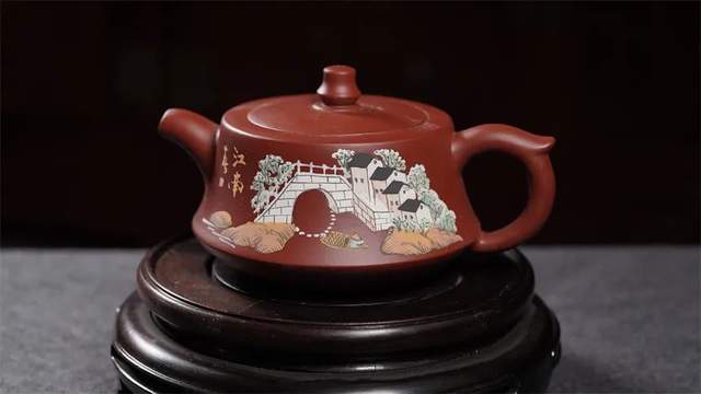 宜兴有天土,吴门出陶人。继陶瓷、紫砂已成国艺。一盈把握,诸子尽在一掬之间,上兑庄老之露、下泡儒佛之泉。禅意不看红尘事,一捧紫砂释天机。