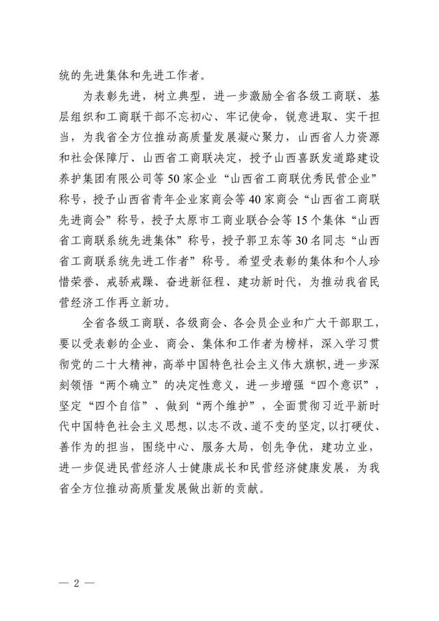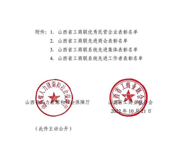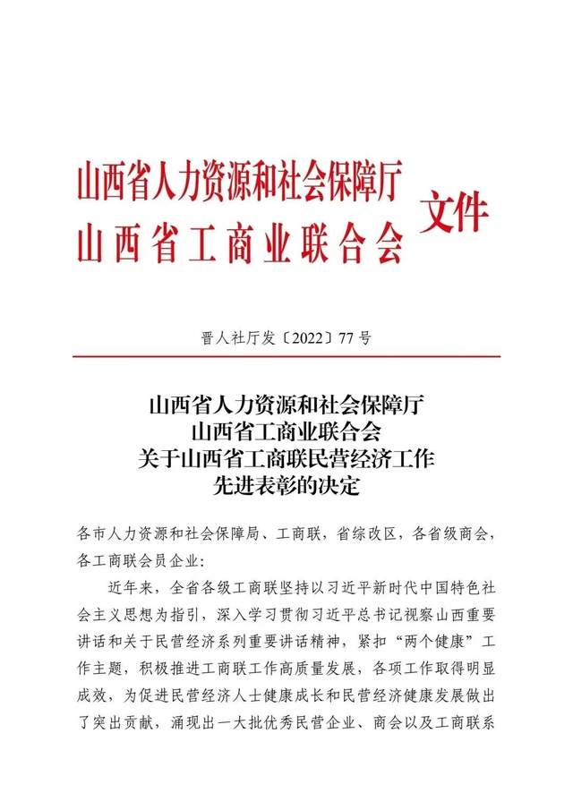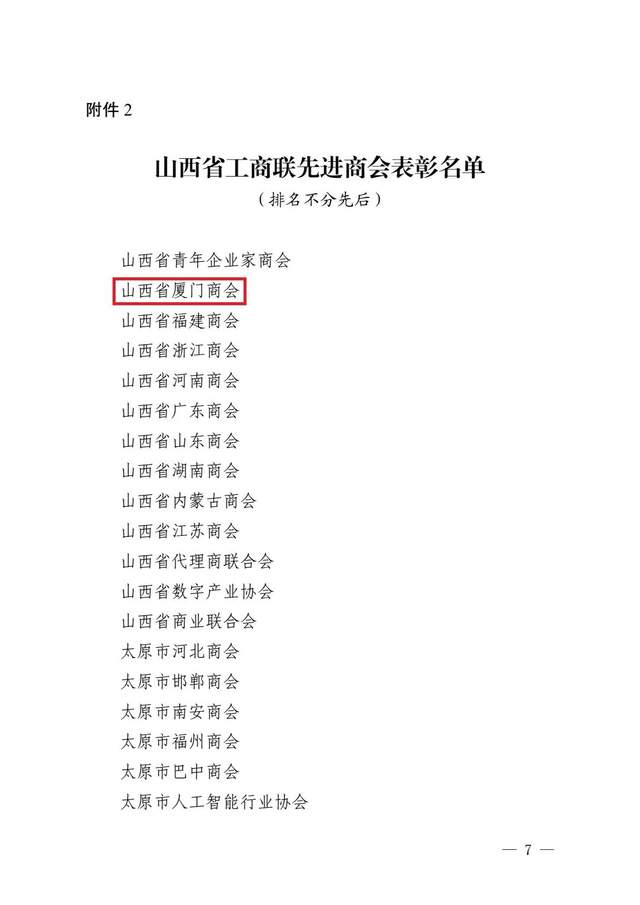 为表彰先进,树立典型,进一步激励全省各级工商联、基层组织和工商联干部不忘初心、牢记使命,锐意进取、实干担当,为我省全方位推动高质量发展凝心聚力,山西省人力资源和社会保障厅、山西省工商联决定,对50家“山西省工商联优秀民营企业”、40家“山西省工商联先进商会”,15个“山西省工商联系统先进集体”,30名“山西省工商联系统先进工作者”予以表彰。山西省厦门商会被评为“山西省工商联先进商会”。