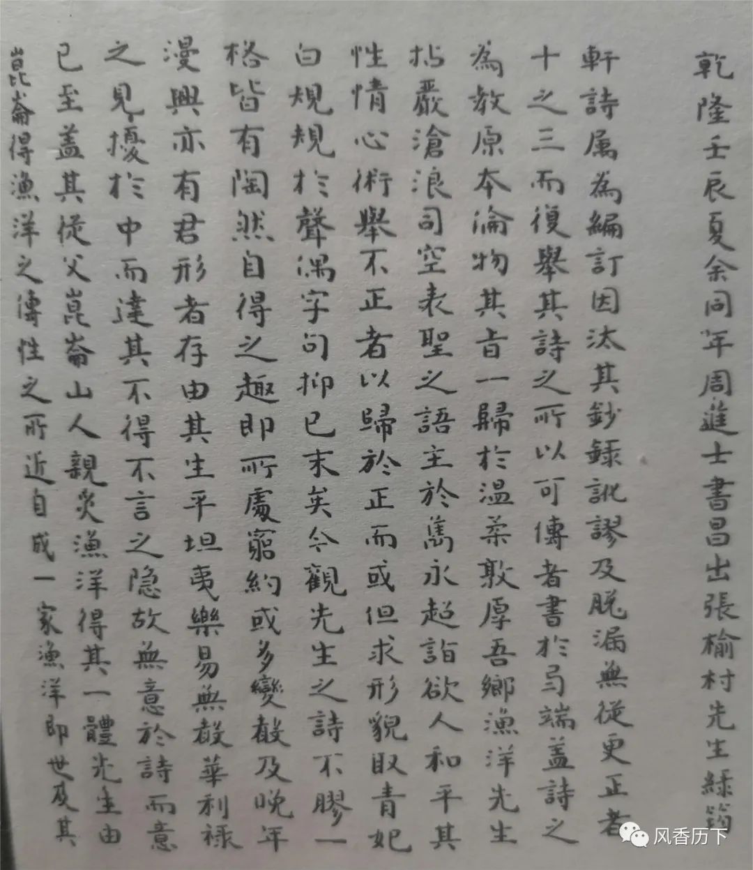 乾隆壬辰夏,余同年周进士书昌出张榆村先生《绿筠轩诗》属为编订,因汰其抄录讹谬及脱漏无从更正者十之三,而复举其诗之所以可传者,书于卷端。……今观先生诗,不胶一格,皆有陶然自得之趣。先生自崑崙而得渔洋之传,性之所近,自成一家……而先生不涉歧途,不屑规抚,独得温柔敦厚之旨,为不可及也。然则学渔洋者必如先生,而始可谓善学也已。