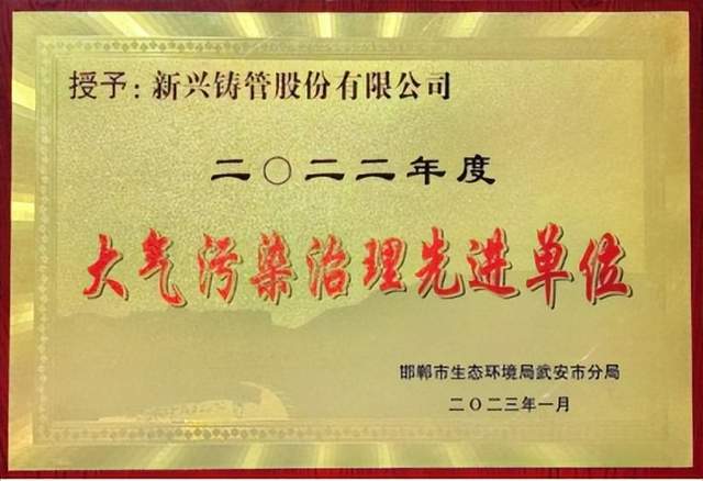 22年度武安本级在大气治理方面作出的突出贡献,特授予新兴铸管股份有限公司2022年度“大气污染防治先进单位”的荣誉称号。