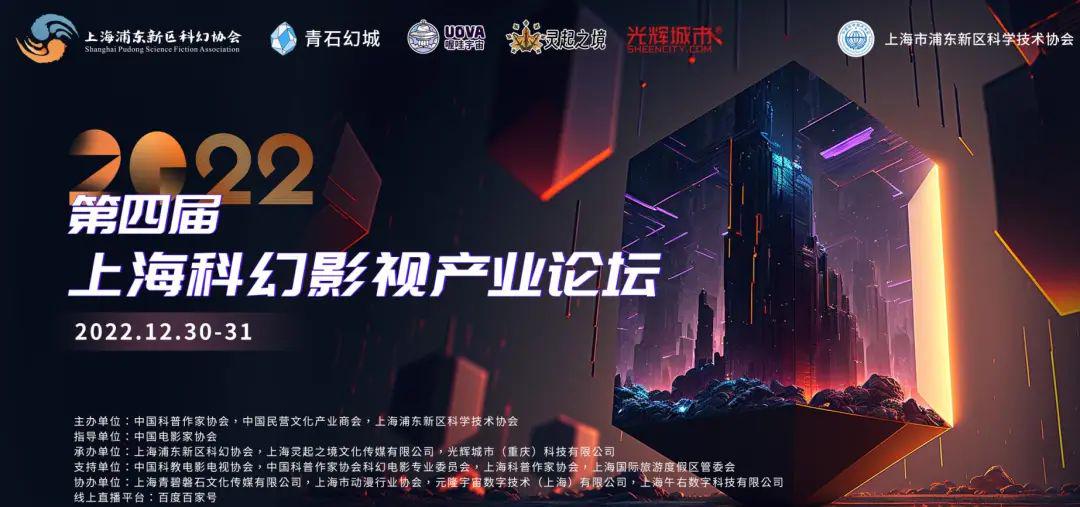 12月30日-31日, 2022第四届上海科幻影视产业论坛以线上直播的形式举行。本次论坛由中国科普作家协会、中国民营文化产业商会、上海浦东新区科学技术协会主办,中国电影家协会任指导单位,中国科教电影电视协会专业工作委员会、科幻委员会,中国科普作家协会科幻电影专业委员会,上海科普作家协会和上海国际旅游度假区管委会,全国少儿科幻联盟等任支持单位,上海浦东新区科幻协会、上海灵起之境文化传媒有限公司、光辉城市(重庆)科技有限公司等共同承办。在聚焦科幻影视产业发展的基础上,本届论坛将重点关注元宇宙时代下科幻数字文娱产业与元宇宙技术的结合与未来展望,以多个专场论坛、高层对话及项目路演的形式,带来一系列2022年最新科幻元宇宙技术与科幻文娱产业结合的技术分享与成果展示,全面推动科幻元宇宙产业联动与合作。