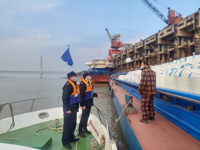 排查治理隐患,净化通航环境。认真贯彻落实上级关于春运工作要求,强化现场安全监管,及时排查通航隐患。春运前夕,鄂州海事处韩国勇处长带队开展全辖段巡航,重点查看了辖区通航、锚泊水域以及采砂作业区,对潘家湾采区作业和运输船舶进行登轮检查。近期受疫情影响,码头作业效率降低,导致辖区待泊船舶持续增加,执法人员现场强化锚泊秩序管控,积极联系码头合理调度船舶进港次序,连续纠正“皖金帆xx”、“豫信货xx”、“皖创业xx”等船舶违章锚泊行为。日常巡航过程中,执法人员坚持对沙洲水道弯曲水域的水深航宽实行每日一测,提醒船舶维护水尺及航行注意事项,及时纠正不按规定航路行驶、超吃水船舶,有效防范搁浅触碰事故发生。