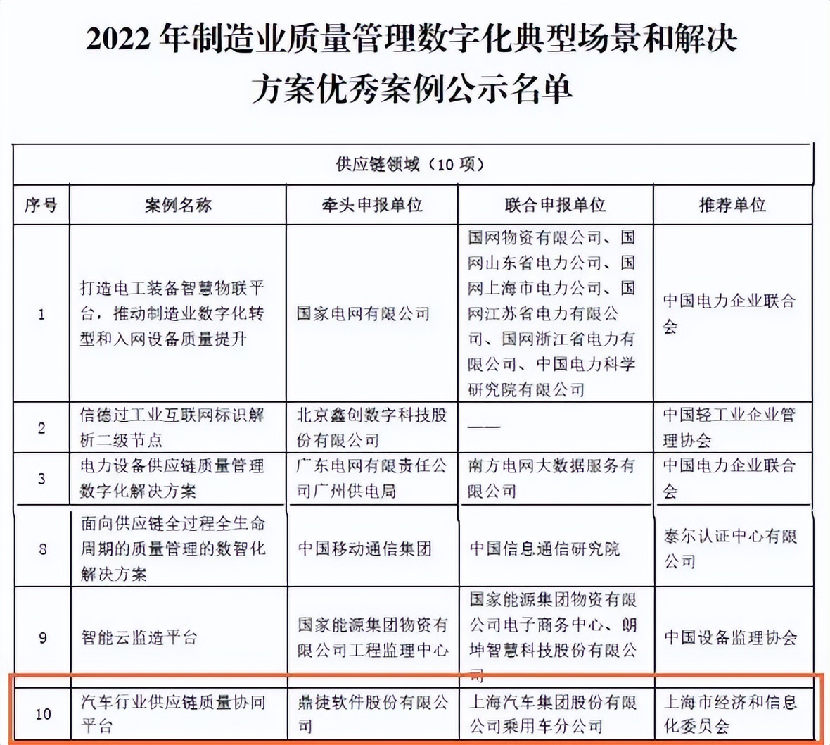 鼎捷软件联合上海汽车集团股份有限公司乘用车分公司申报的“汽车行业供应链质量协同平台”成功入选面向供应链领域的优秀案例,全国仅有10个项目入选。