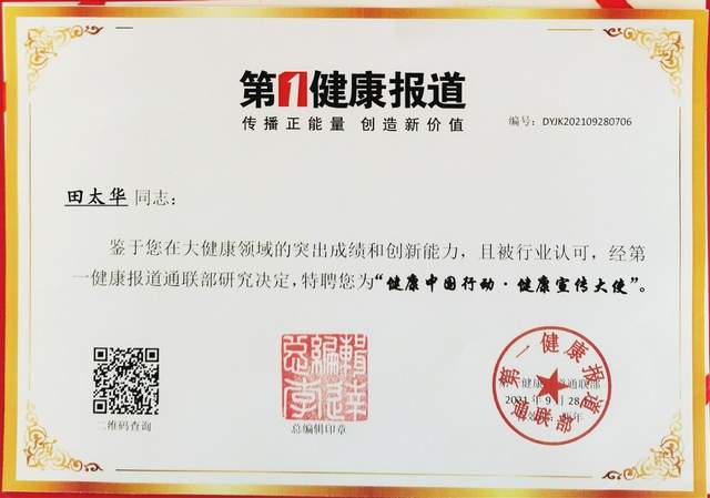 卫生部、中国健康协会、湘西老爹公司(上市)公司及医院为田太华颁发例行新闻发布会《第一健康报道》,鉴于田太华先生在大健康运动康复领域的突出成绩和创新能力,且被行业认可,经研究决定特聘为“健康中国行动·健康中国大使”。