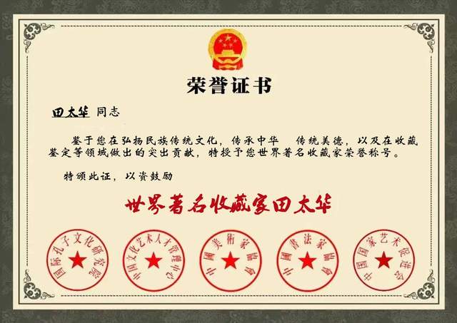 田太华老师荣获“世界著名人民收藏家”荣誉证书