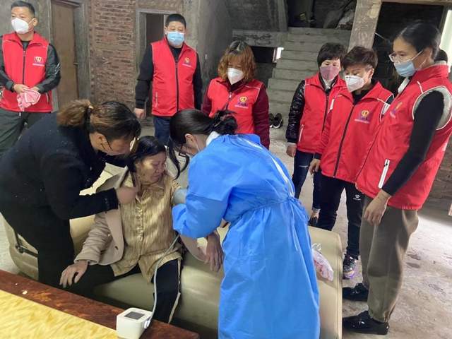 图:志愿者为老年人测量血压