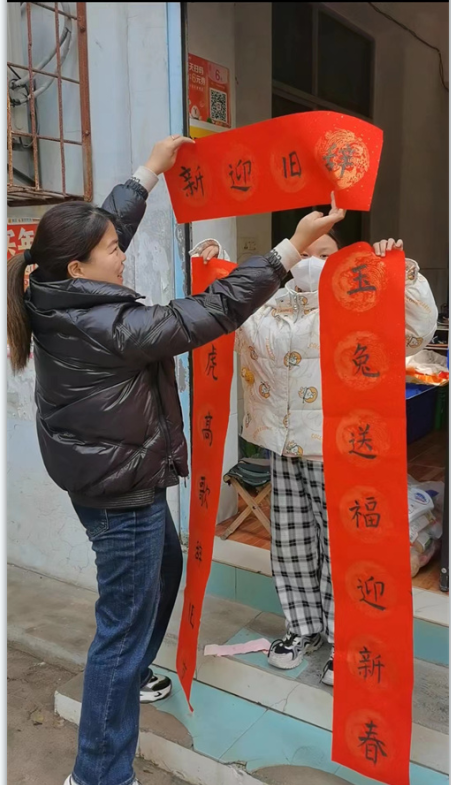 “门迎四季平安福 户纳八方富贵财”、“兔逢新春报吉祥 红梅映雪送春来”……每一副春联,每一张“福”字都饱含着对新年美好的憧憬与期盼。