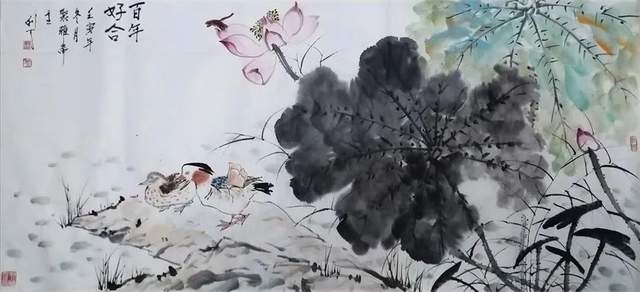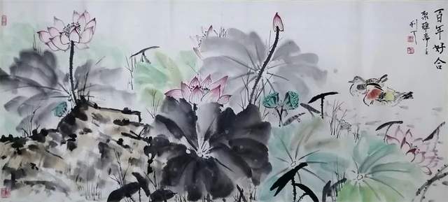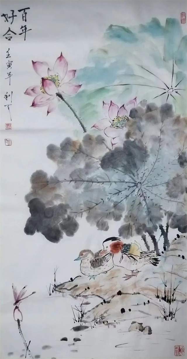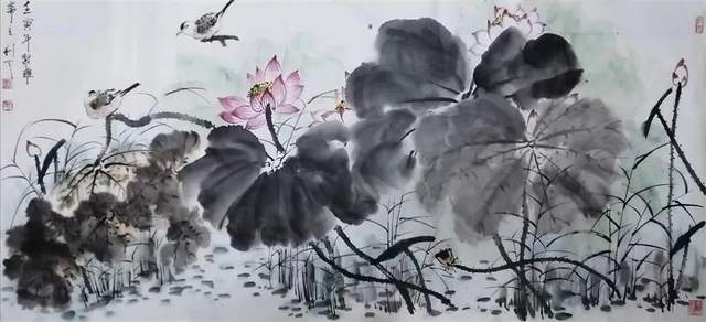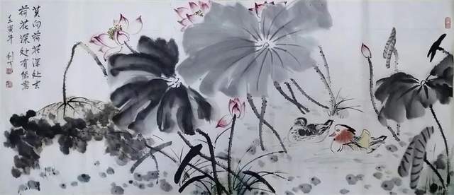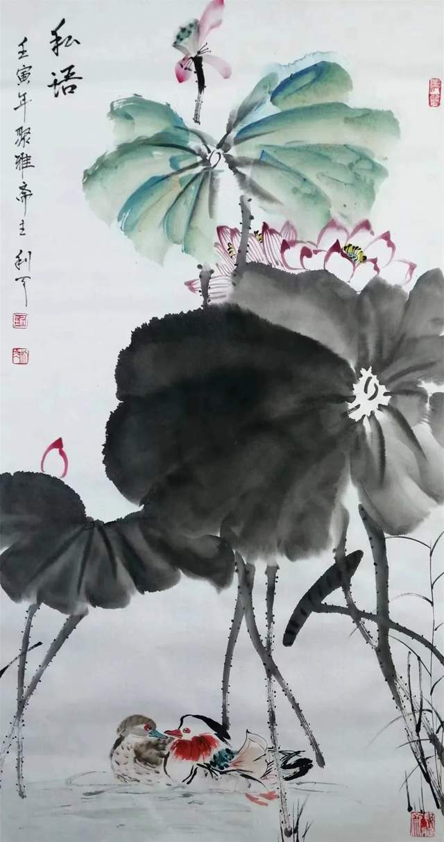 文人画以荷花为题材,荷花在千年的传承中形成了比较严谨而周全的法度范式。后人画荷花,要么过于拘束这些范式,变成了画匠。要么抛弃绕开了这些范式,成为丹青的江湖粗糙。所以面范式法度,一要吸收精华,二要有创新的才华,琚利天先生对荷花的范式法度进行了全面传承,但是不拘泥于旧法当画奴,而是有笔墨当随时代的创新动能,把荷花从一味古旧怀推向时代审美的新视野,既强调荷叶的泼墨渲染,也强调枝茎的筋骨皴擦,又点缀鸳鸯水鸟,让空间元素更为丰富,构图饱满,在景旷情疏的境界里,时时生发着接地气的审美品格。