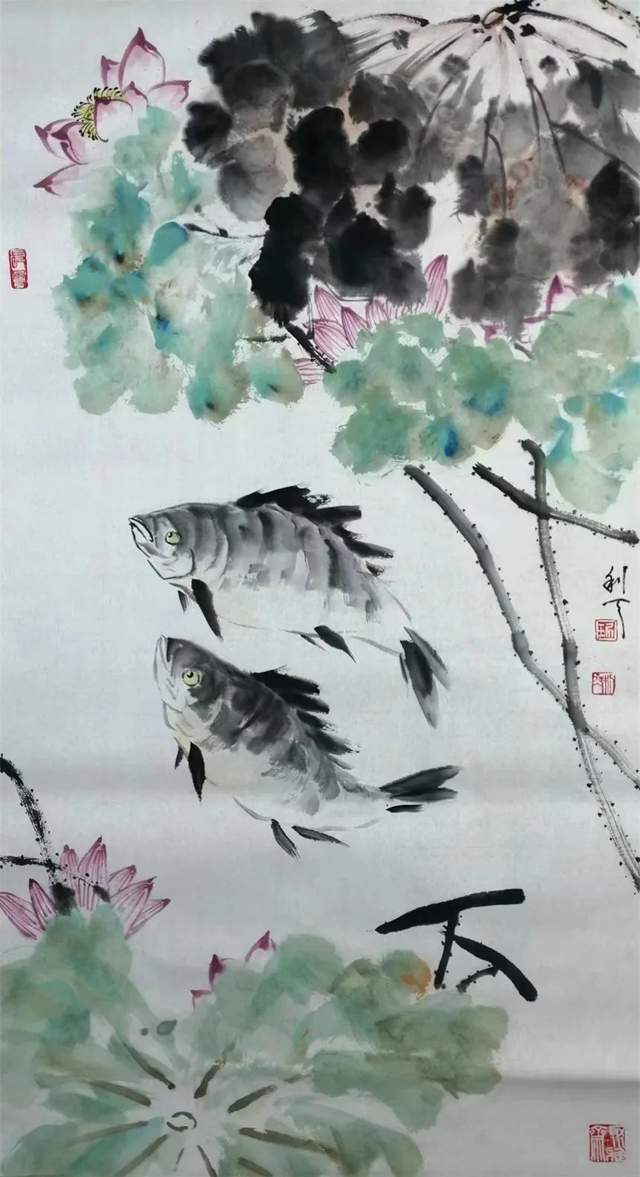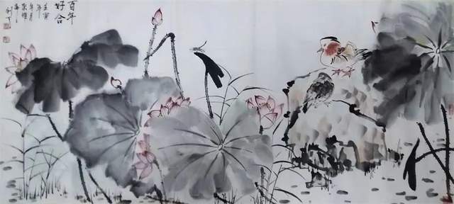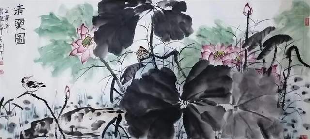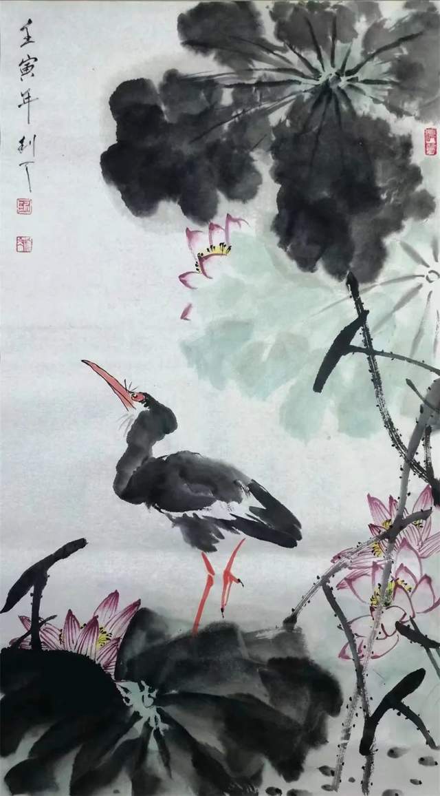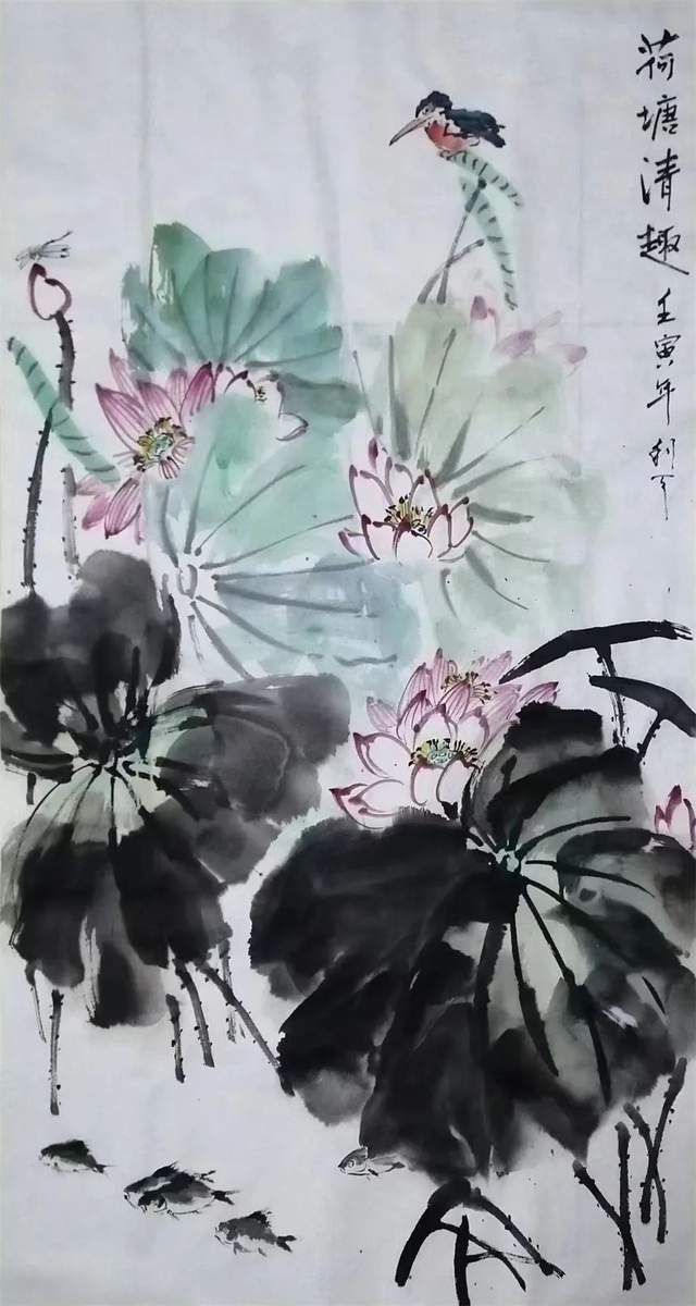 绘画题材广泛,尤喜画荷。不论是夏荷茎挺叶盛花繁,还是残荷茎枯叶残花凋,均用不同笔墨或泼洒酣畅,或揉搓干湿,使之呈现出不同笔墨韵味。再配以不同禽鸟,更生出充满生气,令人神思遐想的意境,使人得到艺术熏陶和对大自然的无限热爱。