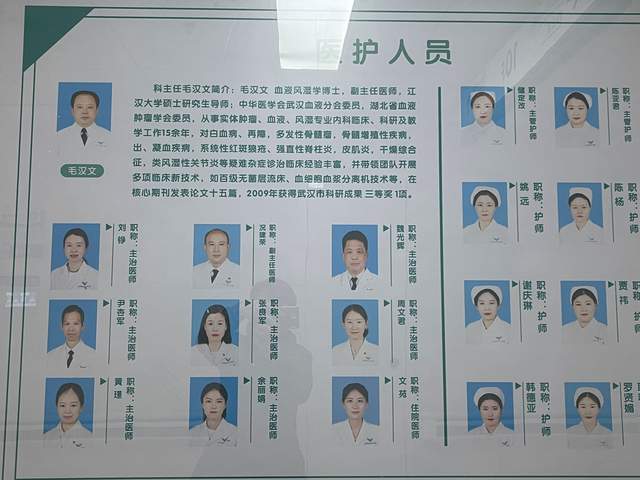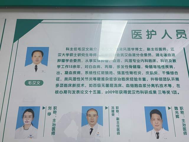 我要特别感谢本科领导毛汉文主任。他是血液风湿学博士,副主任医师,江汉大学硕士研究生导师;中华医学会武汉血液分会委员,湖北省血液肿瘤学会委员,从事实体肿瘤、血液、风湿专业内科临床、科研及教学工作15余年,医术精湛,知识渊博,实践经验非常丰富。可他一点架子都没有,既治病又治心,总是安慰我们,让我们放心,医院肯定会尽全力救治,听到他坚定的话语,我们惶恐不安的心终于放下来。