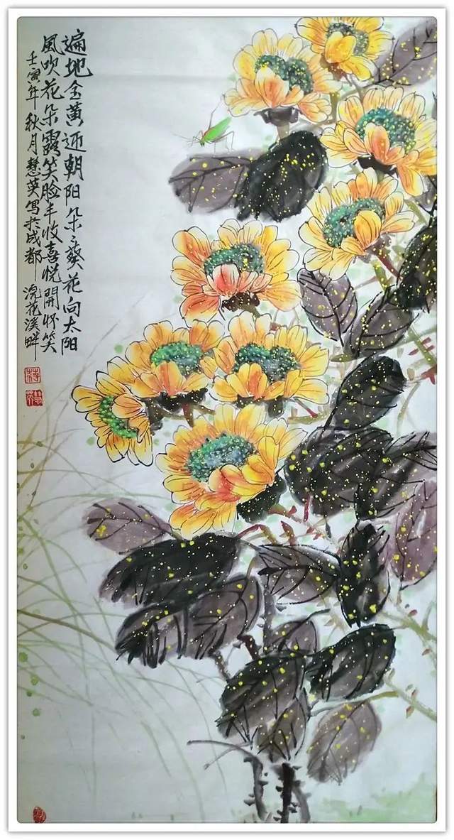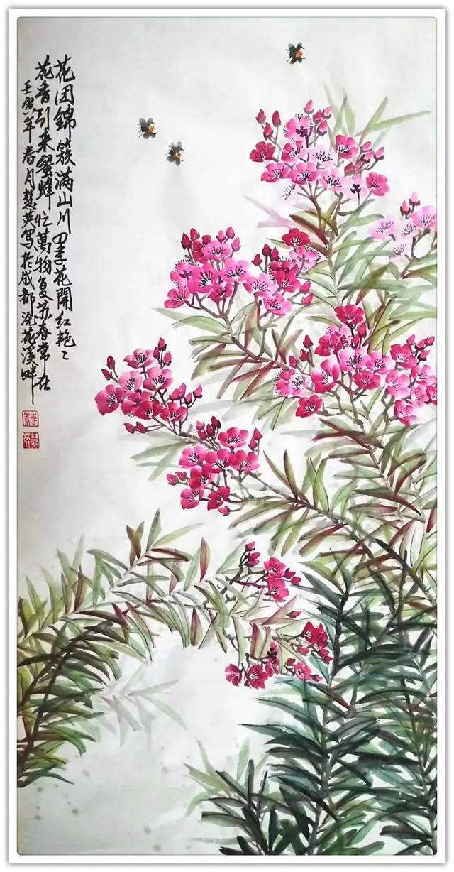 在当代画坛,中国画的画法有点儿乱糟糟的现象,一些人士画画有“乱涂乱抹”的习气,结果画出来的东西粗头乱服,不显雅观,没有赏心悦目的艺术属性。现在你去看蒋慧英女士的所有作品,都相当注意用心营造唯美的气氛,落笔定位准确,笔笔相生,笔笔到位,比如《花团锦簇满山川》这样的作品,既是执笔在手,运笔在心,心有竹成的塑造过程,所以画质天然,遂心应手。