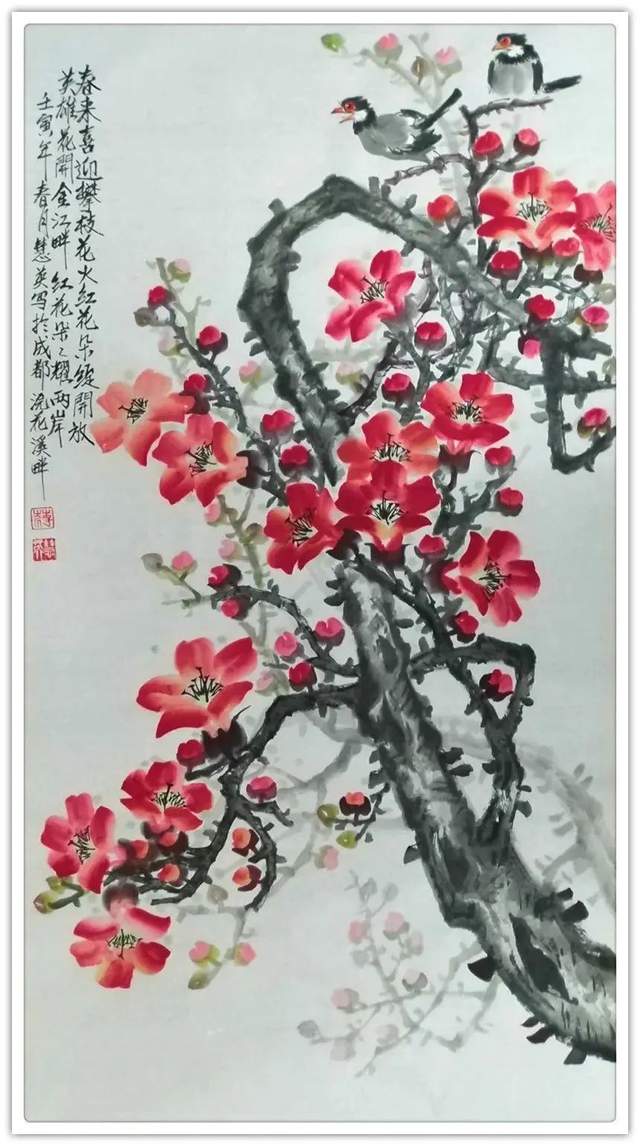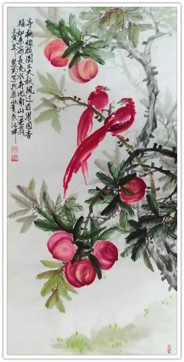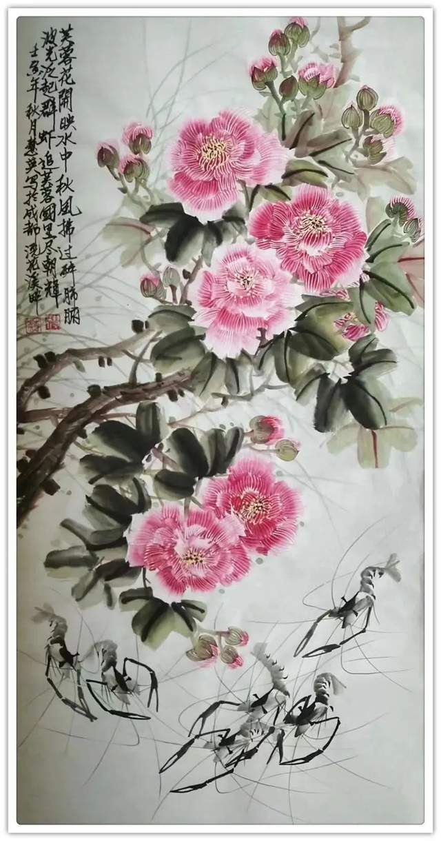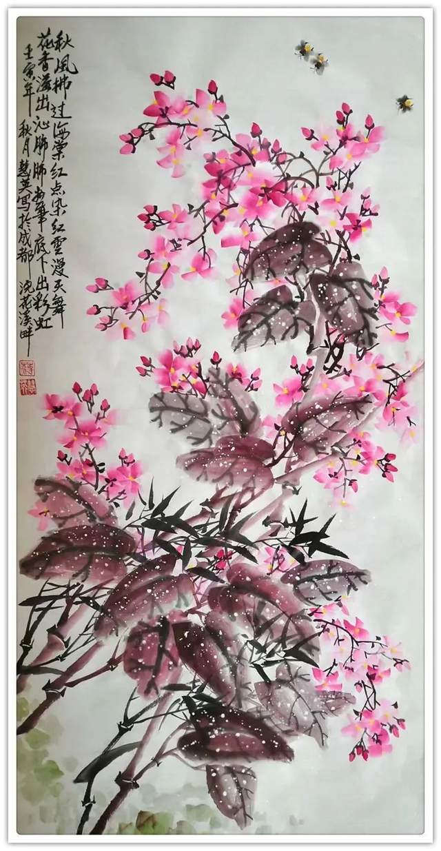 还有《秋风拂过海棠红》这里面既没有涂的乱,也没有抹的浊,干干净净画天朗,清水濯洗绘气清,秋风秋韵,扑面盈心,如读过的一首唐诗,如诵过的一段宋词,越看越有滋味,极其耐读。作为一名女画家,蒋慧英女士为当代画坛奉献了非常令人陶醉的丹青佳作,让人在惠风和畅的气氛里游目骋怀,足以极视听之愉!