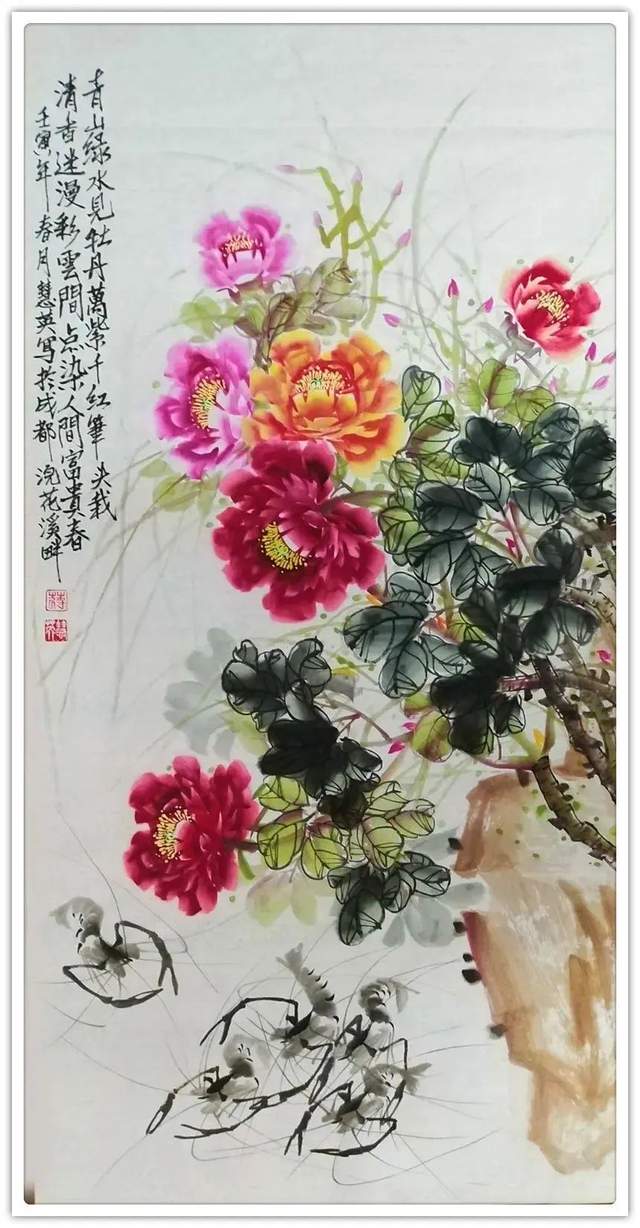 精湛的画法,除了有自我修炼的原因之外,还有法由师授的机缘。蒋慧英女士曾经师从王西林、马小松诸先生,得到口传手授,更好地觉悟了画道。又私娴齐白石画法,追求妙在似与不似之间的玄机要妙,不因似而俗,不因不俗而欺世,带着兼工能写的炉火纯青作花鸟,可在夺物象之精神,可以掠物象之体貌,所画牡丹最具独家特色!娇而不艳,枝味铺陈得相当天质自然,以求空间灵动大气,花头艳而不俗,不着丝毫烟火气,全似臻域仙子来!