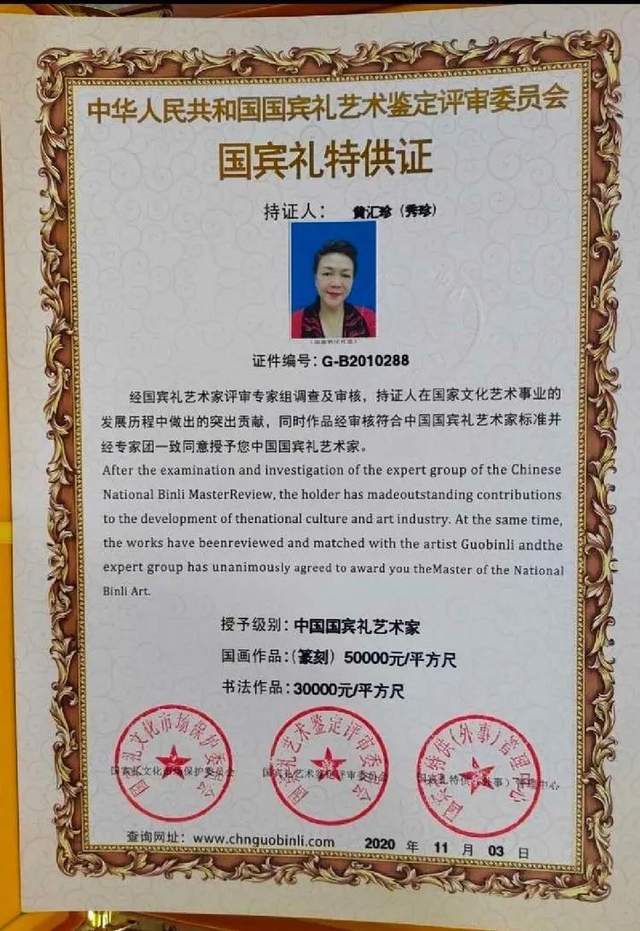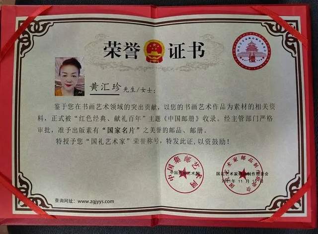 艺术简历:国礼艺术家黄汇珍:字秀珍—— 1964年出生在国石之乡福建福州,现定居北京。自幼酷爱寿山石雕刻艺术,着迷于前辈大师的珍品。17岁师从名家王炎銓、林训多大师学习雕刻技艺,自学篆刻艺术,勤学苦练,博取众长,向前辈以及同仁学习。寿山石成为她能够激起一切情感、一切愿望的因素,她与石结下了不解之缘。弘扬中华民族传统文化艺术,从事寿山石雕刻与篆刻艺术30多年。曾多次应邀参加中国国家级工艺美术大师博览会、中国天工奖国际珠宝玉石博览会、中国民间艺术博览会等,并多次荣获得大奖,金奖银奖十几次。曾为许多国内外领导人及部队官兵、企业家老板、书画老师刻过章。自学篆刻书法艺术,擅长龙篆、龙爪篆、鸟虫篆、金篆、大篆五体书法,勤学苦练、博取众长,形成自己的风格。作品多次应邀参加全国第四届中华杯诗书画印艺术大大赛荣获金奖、荣获全国第五届中华杯诗书画印艺术作品大赛荣获入选获得特别金奖!荣获世界非物质文化遗产大会主席吉姆余慈授予黄汇珍女士世界非物质文化遗产大会传承大奖。书法篆刻作品在民族强文化强:国家名片中国邮政发行邮票。在中国邮政:建党百年华诞献礼名家发行邮票。在魅力中国、闪耀世界!世界邮票上的艺术名家发行邮票。许多寿山石、篆刻、书法作品作为国礼赠送国内外领导收藏。诸多书法作品被国内外领导和有关单位机构以及个人收藏。