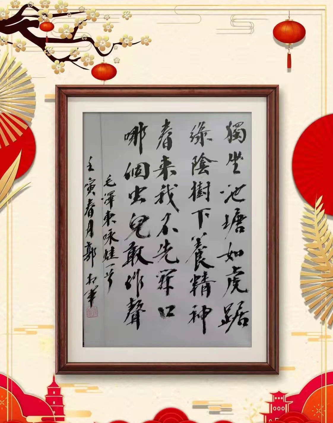 作品,行云流水的笔法遒劲有力,令人陶醉于线条,笔画之中,颇具顔体和二王书风。极具感染力,墨色中有浓有淡,浓中显精神,淡中透出灵气,且疏密有致,留白中带出空灵之韵致,不愧风格高雅,气韵有致。笔墨中彰显出自信与钻研精神。再此作品中四个【春】字的不同笔意,二个【到】字的不同写法,以及【雨】字的象形,【冰】字的飞白,使作品增色添彩。整幅章法,结构墨迹分明,大,小,浓,淡,疏,密,层次清晰,从作品的书写神韵和艺术情趣中,感悟到梅花在冰凝百丈、绝壁悬崖上傲然挺拔,坚冰不能损其骨,飞雪不能掩其俏,险境不能摧其志的精神; 领悟到梅花烂漫无嫉意, “丛中笑”共享春光喜悦,脱俗、至刚无欲,且报春不争春的高贵品质!实乃是不可多得的精品佳作!且极具收藏价值,保值,升值空间极高。到手就升值!