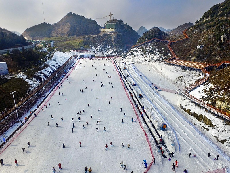 作为贵州省冬季游的主打阵地,依托冰雪资源,六盘水坐拥梅花山国际滑雪场、玉舍雪山滑雪场、乌蒙滑雪场,共建有高、中、低赛道21条,每日能同时容纳1.5万人滑雪。