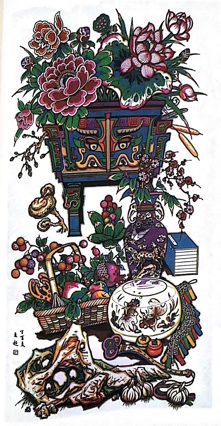 这幅年画作品将方鼎、花瓶、果篮、金鱼、如意、灵芝等诸多吉祥元素汇集在一起,寓意吉祥、画面饱满、用色鲜亮,民俗特色浓厚。表达了对祖国的歌颂与祝福,祝愿伟大祖国繁荣昌盛、吉祥如意!