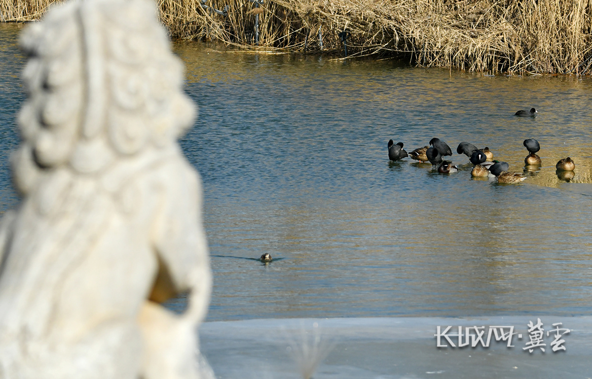 在京杭大运河沧州中心城区段南川楼码头水域,绿头鸭、白骨顶鸡、小鸊鷉等水鸟或游弋觅食或小憩。苑立伟 摄
