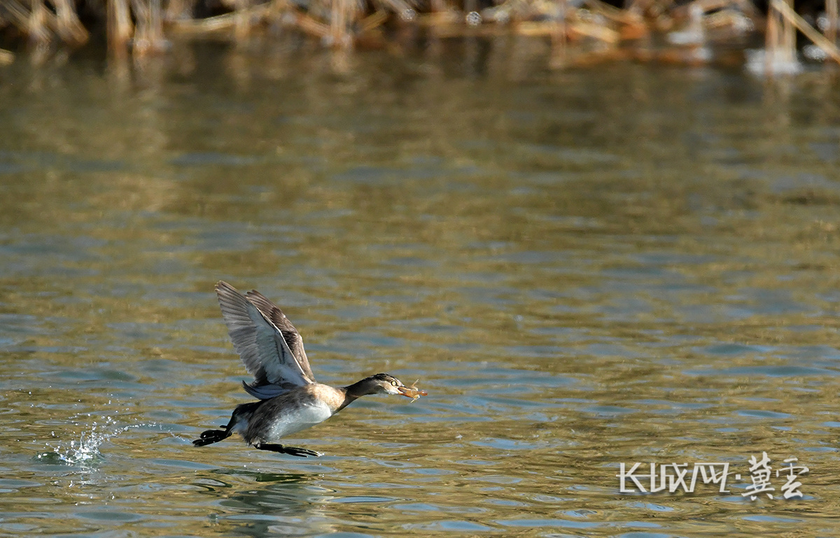 在京杭大运河沧州中心城区段南川楼码头水域,一只小鸊鷉觅食后振翅起飞。苑立伟 摄