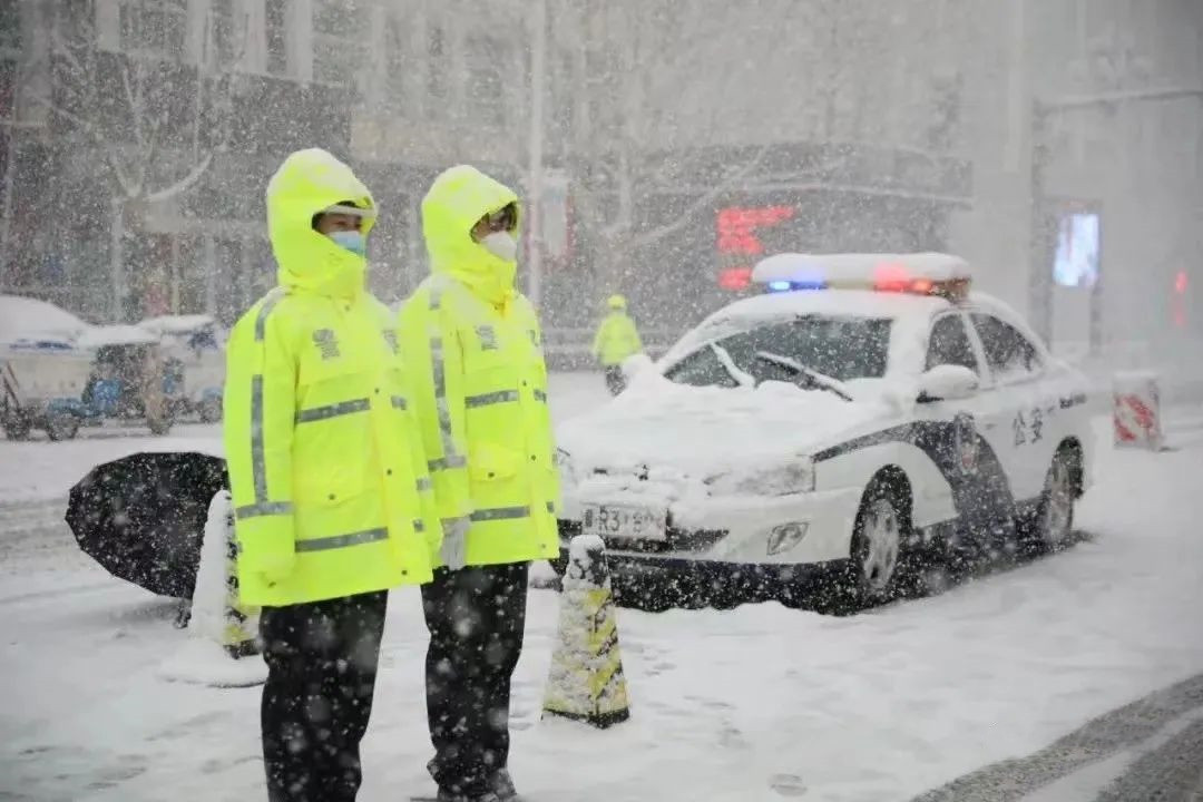 交警在雪中值守。