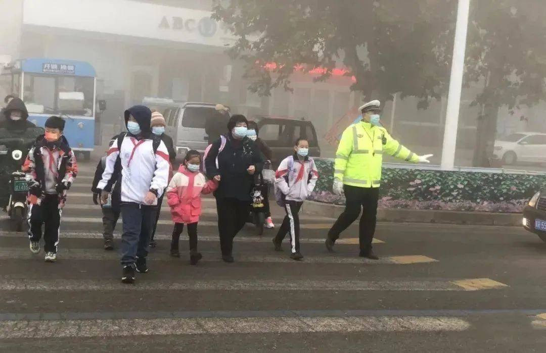 交警雾中引导学生过马路。