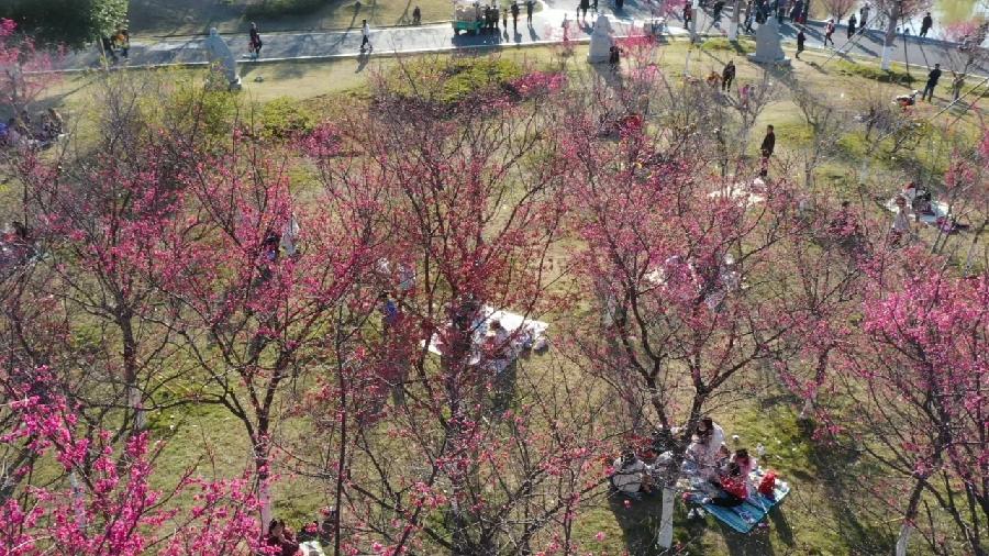 走进客家文化公园先贤雕塑园内,600多株粉红色的樱花踏着春天里的脚步竞相开放。园内的中国红樱花色泽艳丽,犹如一片红云美不胜收,成为城市一道亮丽的风景线。记者在现场看到,来这里休闲、赏花的市民络绎不绝,市民纷纷在满园春色中拍下自己的美照。