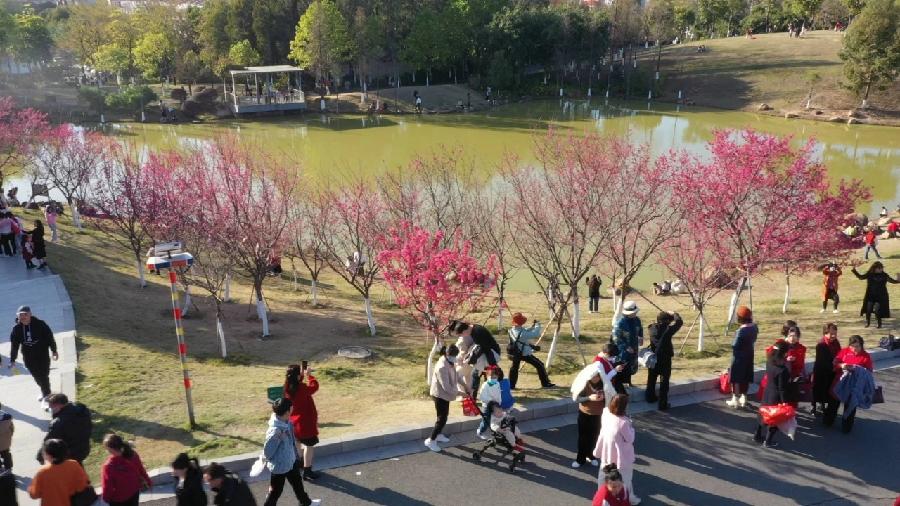 河源市客家文化公园管理处主任陈俊中表示,“目前公园里盛开的花基本都是比较喜庆的颜色,接下来会有黄花风铃木、宫粉紫荆等,很多市民都想来这里踏青打卡。