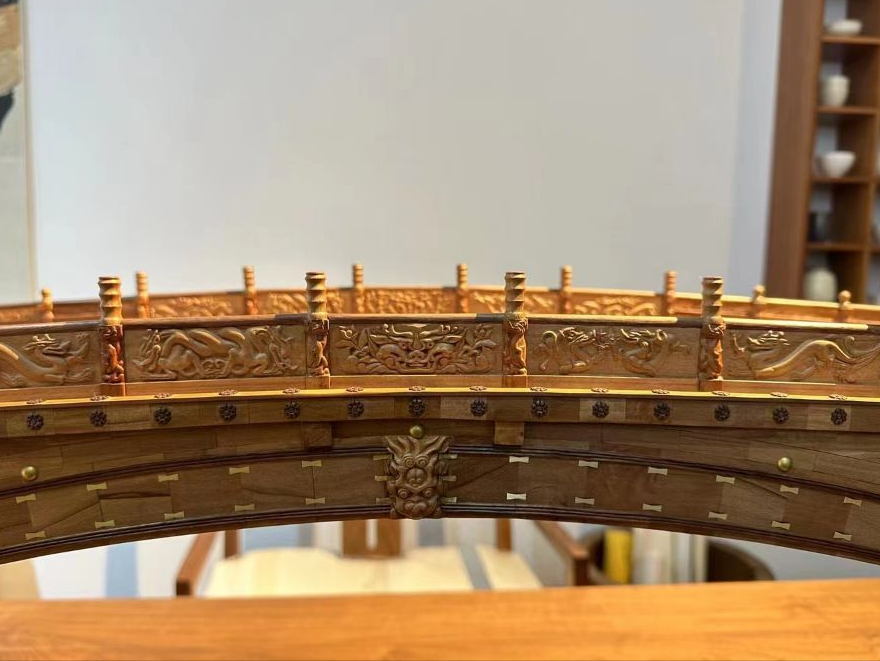 河北长城新媒体集团电子商务有限公司大力发展文化产业,着力输出符合文化创意、市场需求和线上线下流通的文创精品产品。2022年,河北长城新媒体集团电子商务有限公司联系木工匠人傅星卫精心打造了一座“榫卯结构的木制微缩赵州桥”,微缩赵州桥选用赵县当地的雪花梨木作为材质,结合实物按1:36的比例还原纯手工制作,历时四个多月终于完工!
