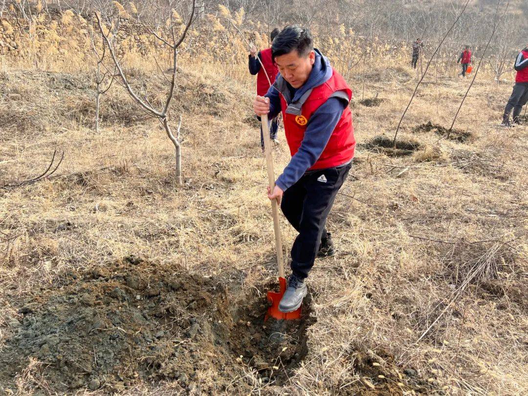 志愿者们虽然都生活在城市,工厂,但像栽板栗树这样的活儿从2008年开始到现在也有15年的经验了,所以干起活来也是驾轻就熟。挖坑、栽树、浇水、培土大家配合默契,到当天中午,山坡上一块块地里就立起了一片片果林。