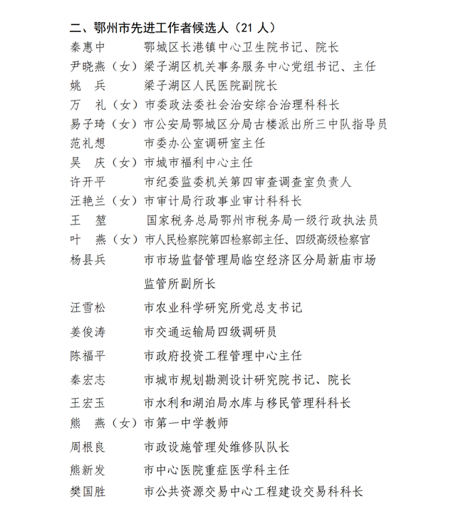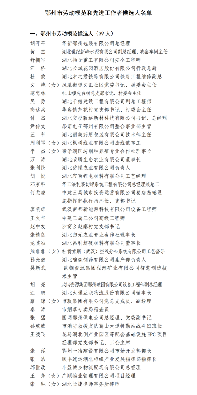 根据鄂州市劳动模范管理办公室《关于做好2023年鄂州市劳动模范和先进工作者评选表彰工作的通知》(鄂州劳模办[2023]1号)精神,经市委、市政府研究决定,在2023年“五一”前夕表彰60名鄂州市劳动模范和先进工作者。经基层推荐、市劳模办初审、市劳模评选领导小组研究审定,现将鄂州市劳动模范和先进工作者候选人名单予以公示。